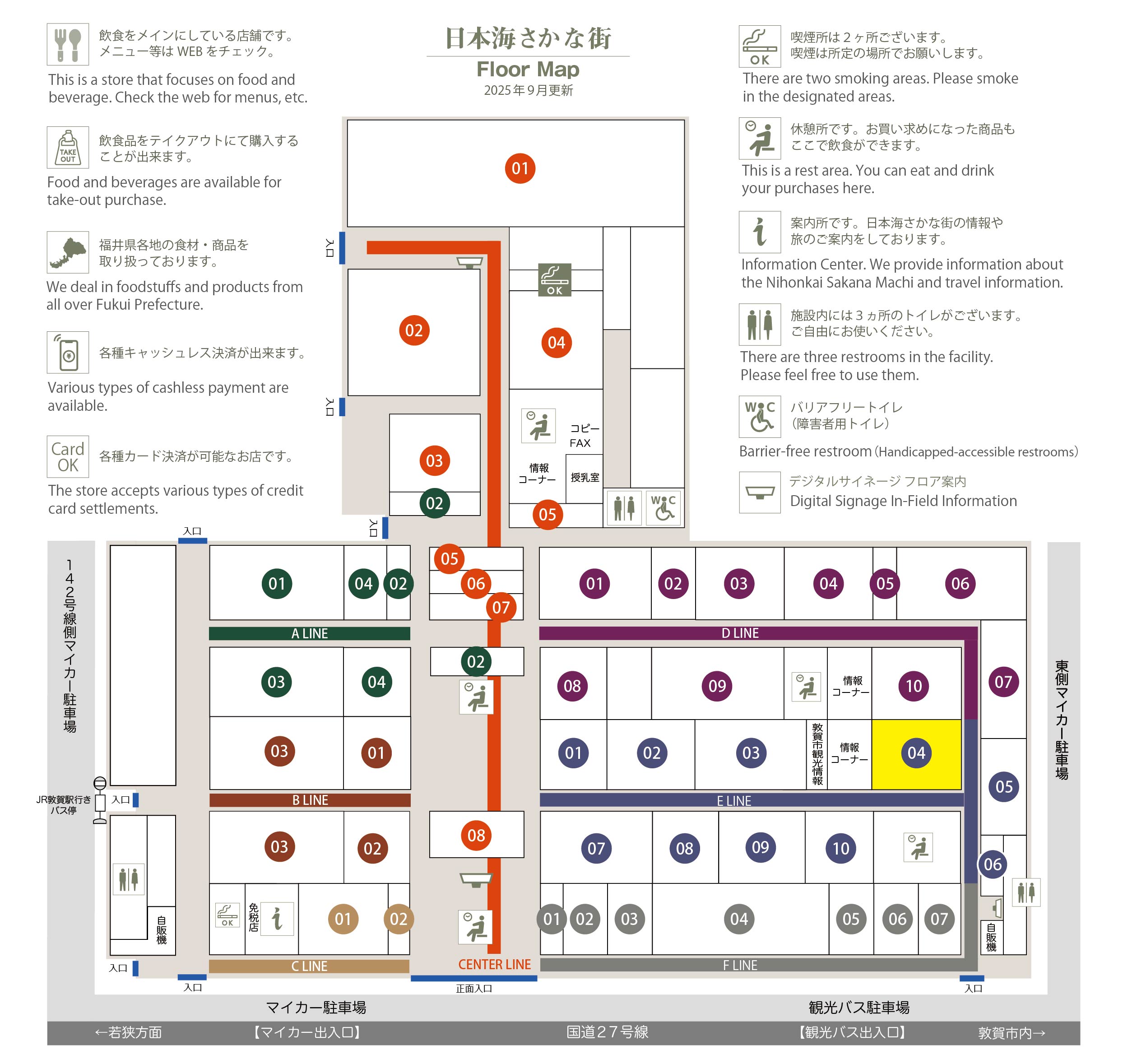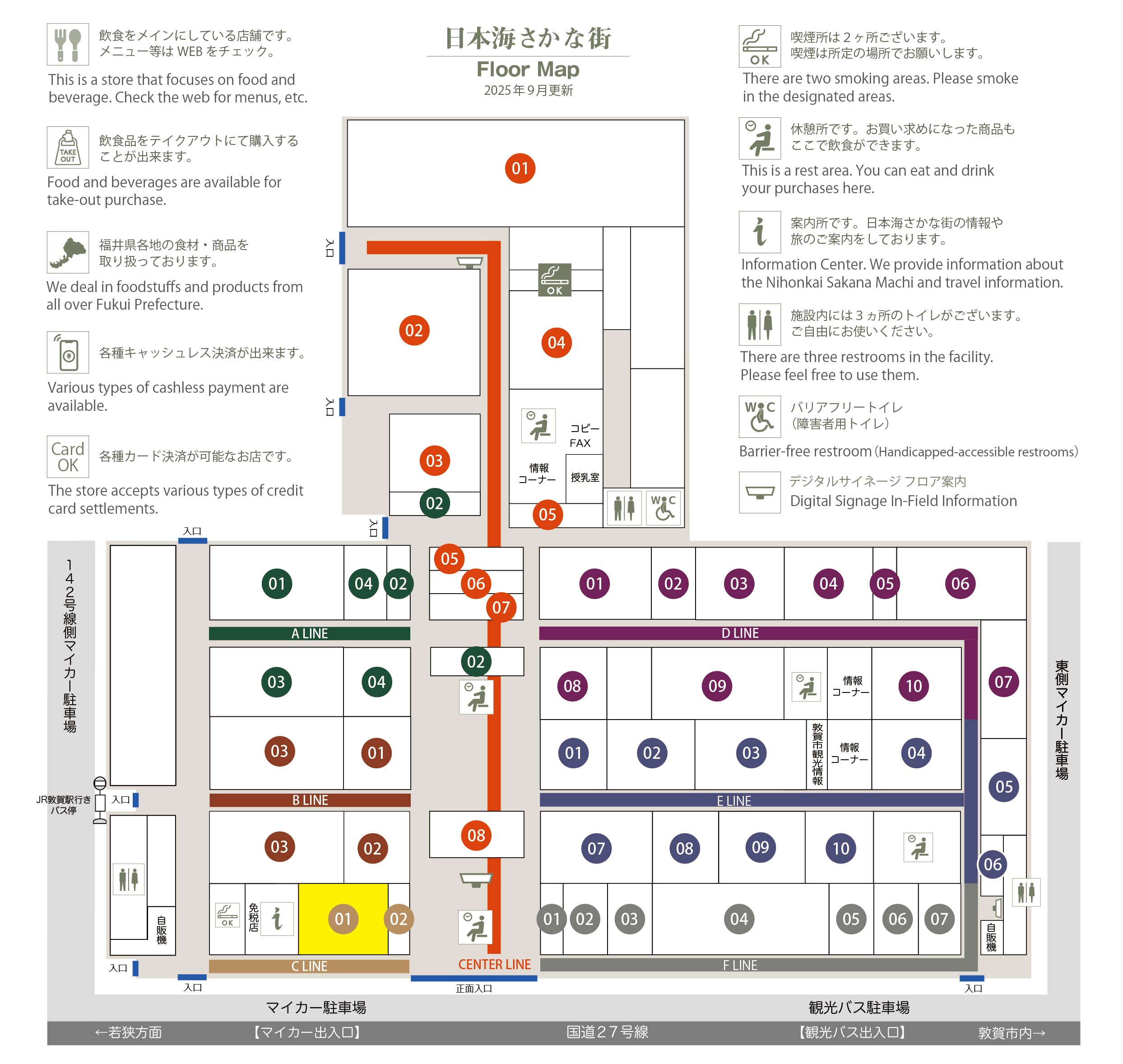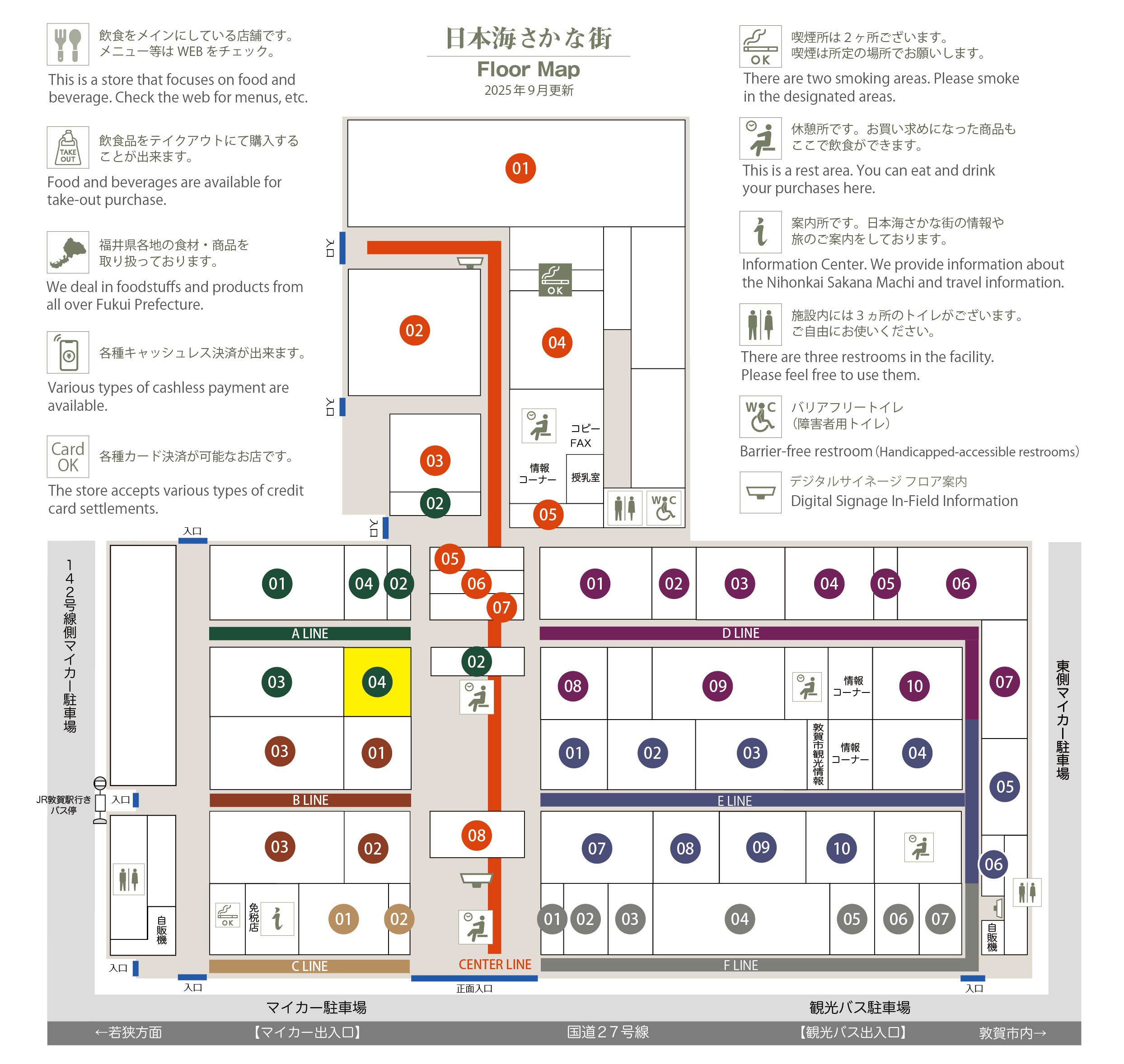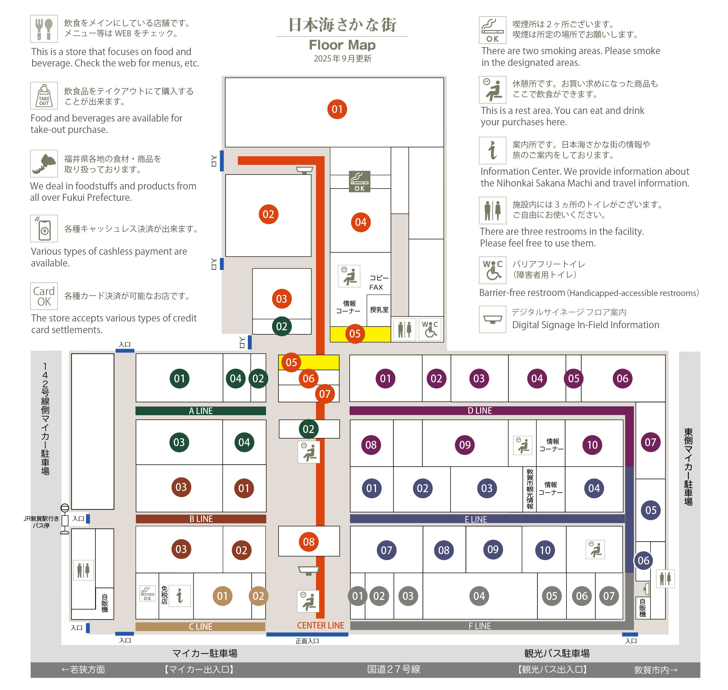 このマップでは、通路に面したお店をラインカラーと番号でご案内しております。