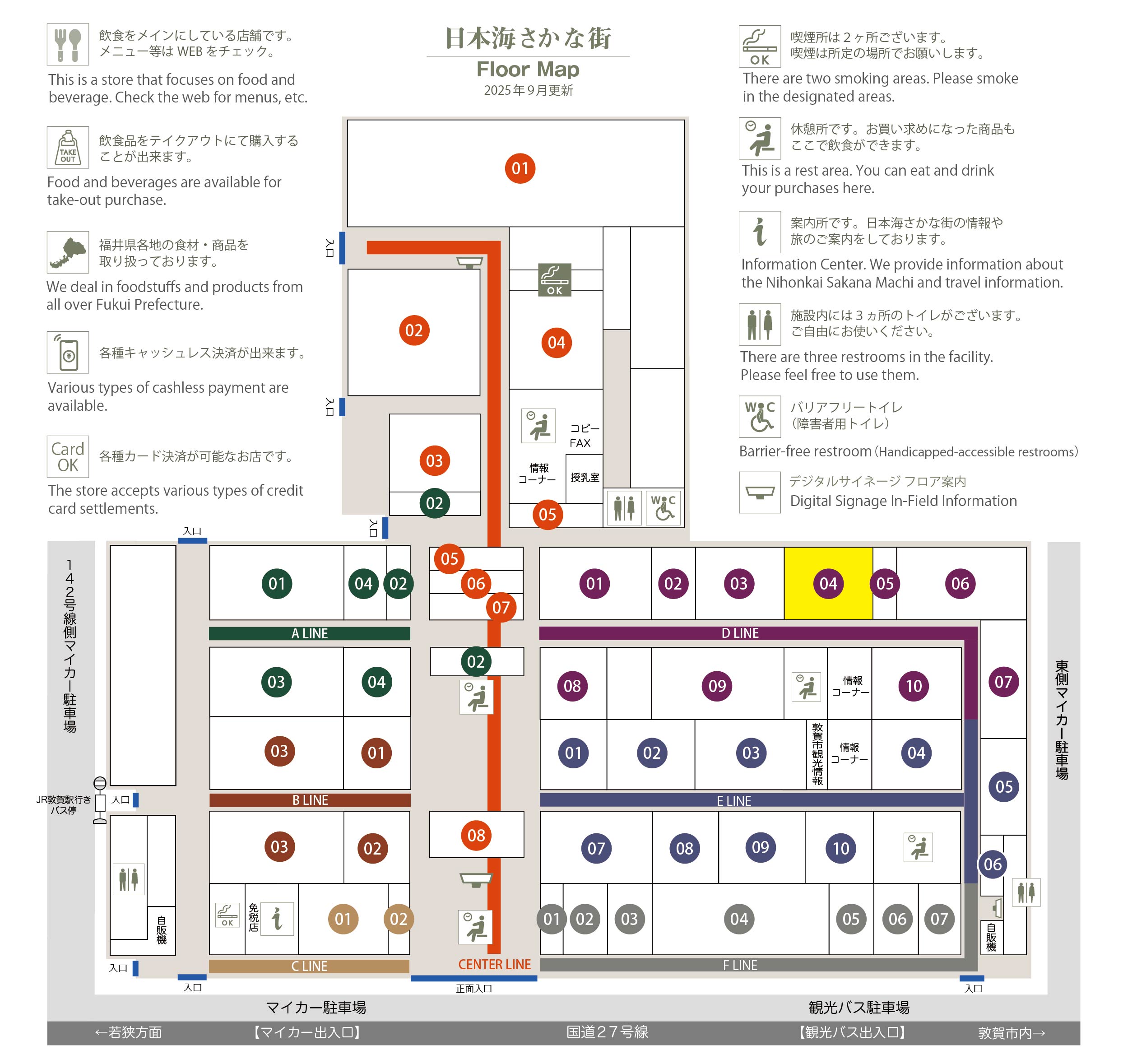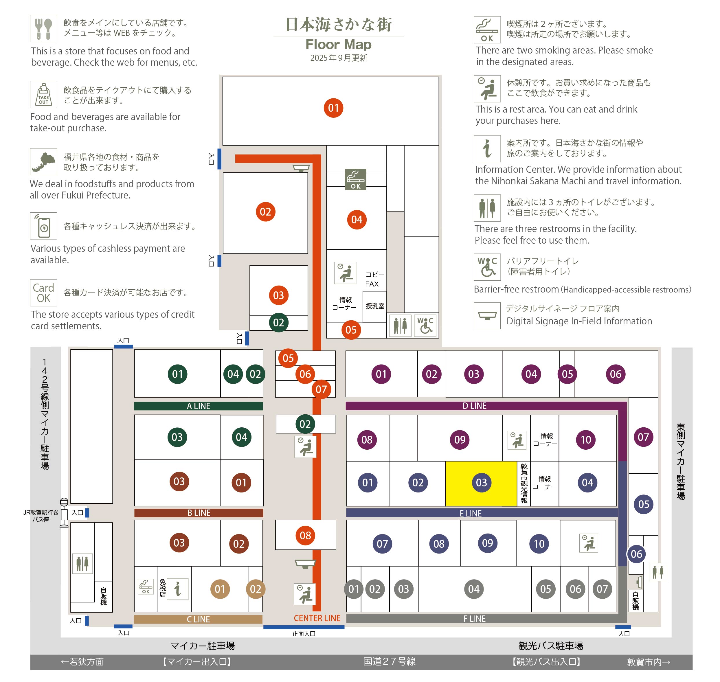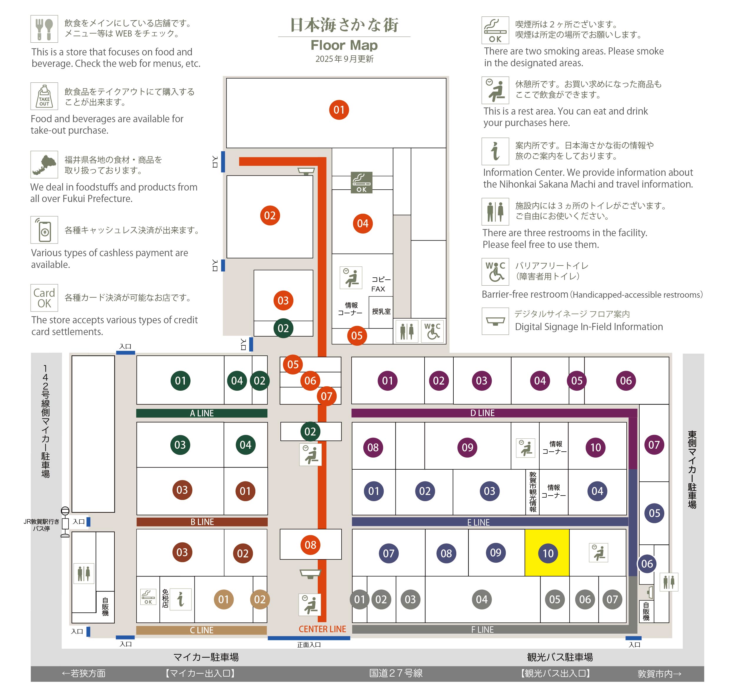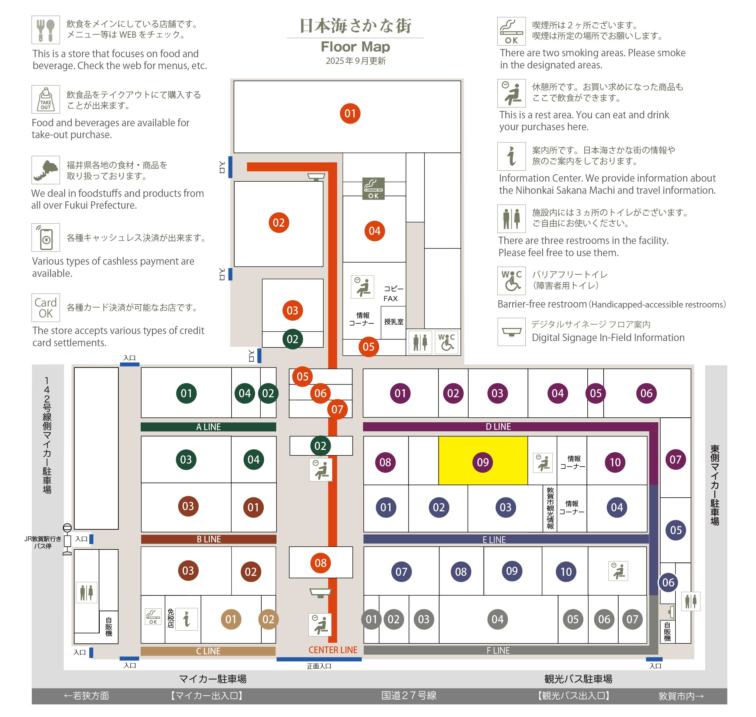 このマップでは、通路に面したお店をラインカラーと番号でご案内しております。
