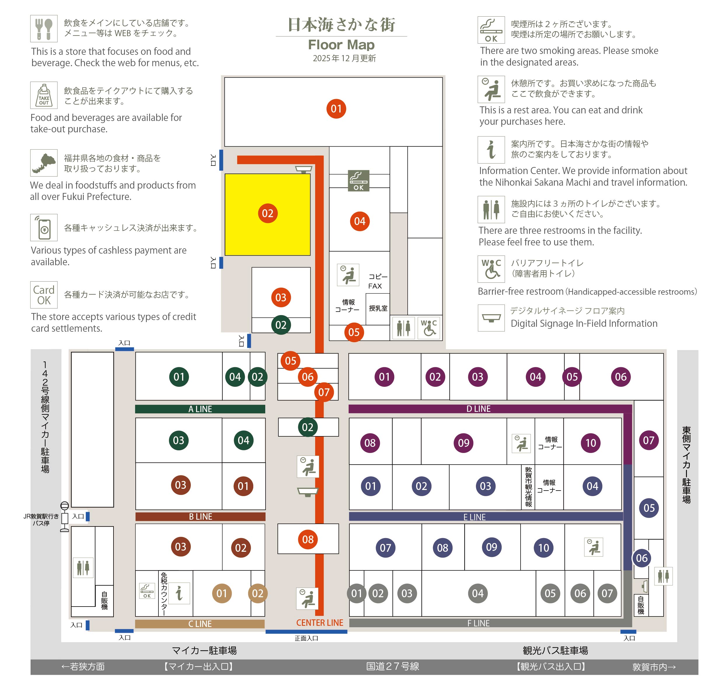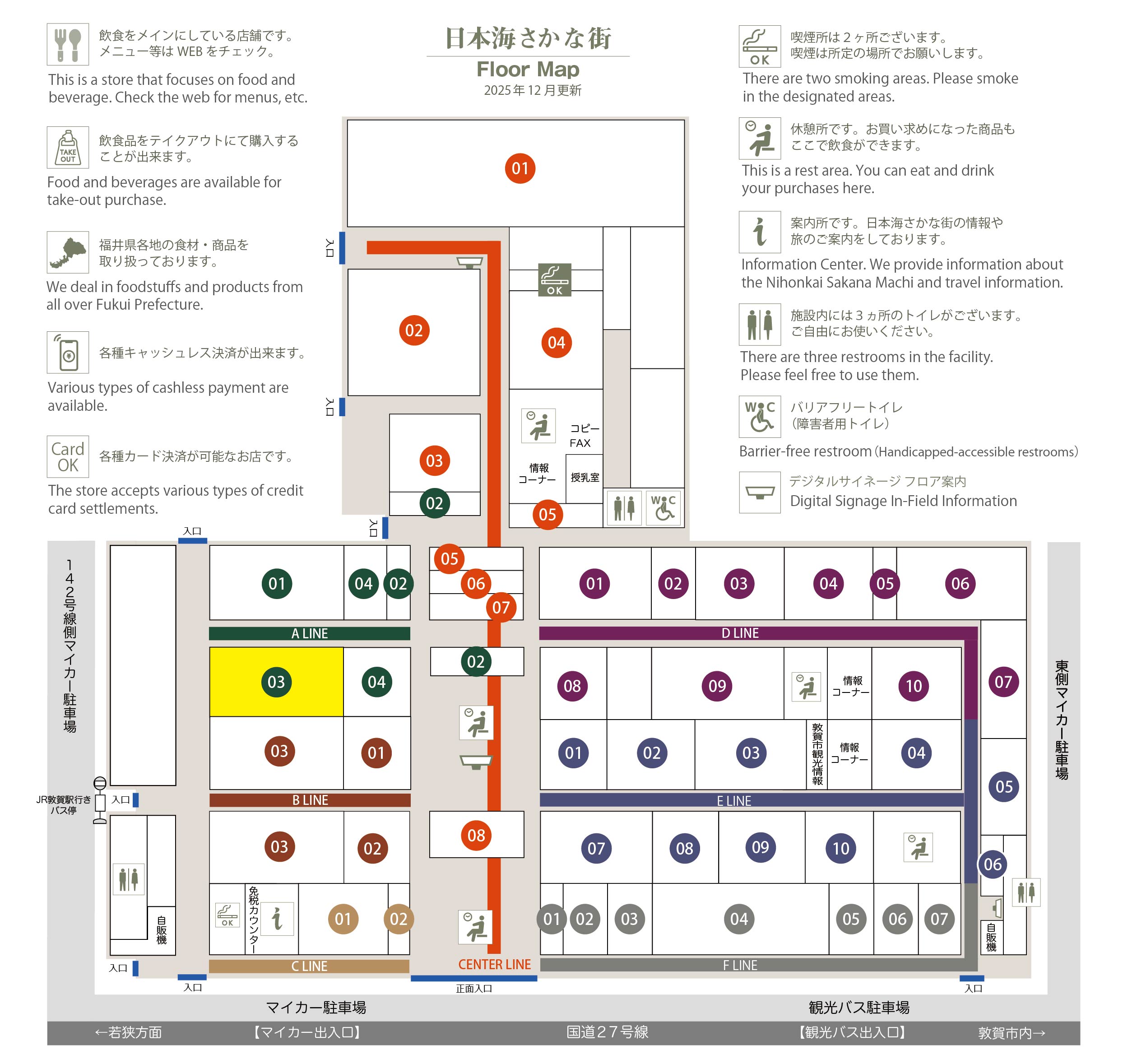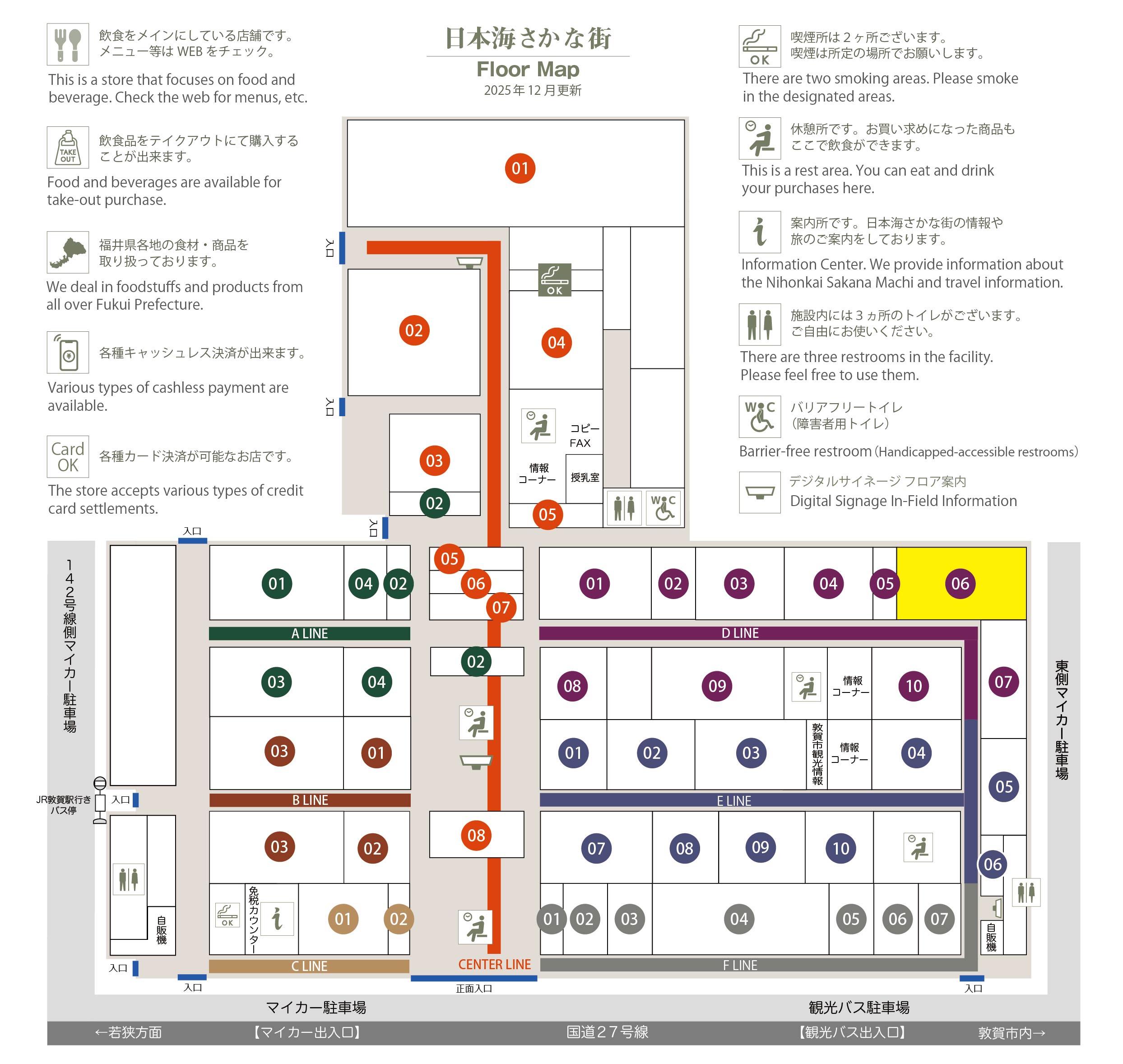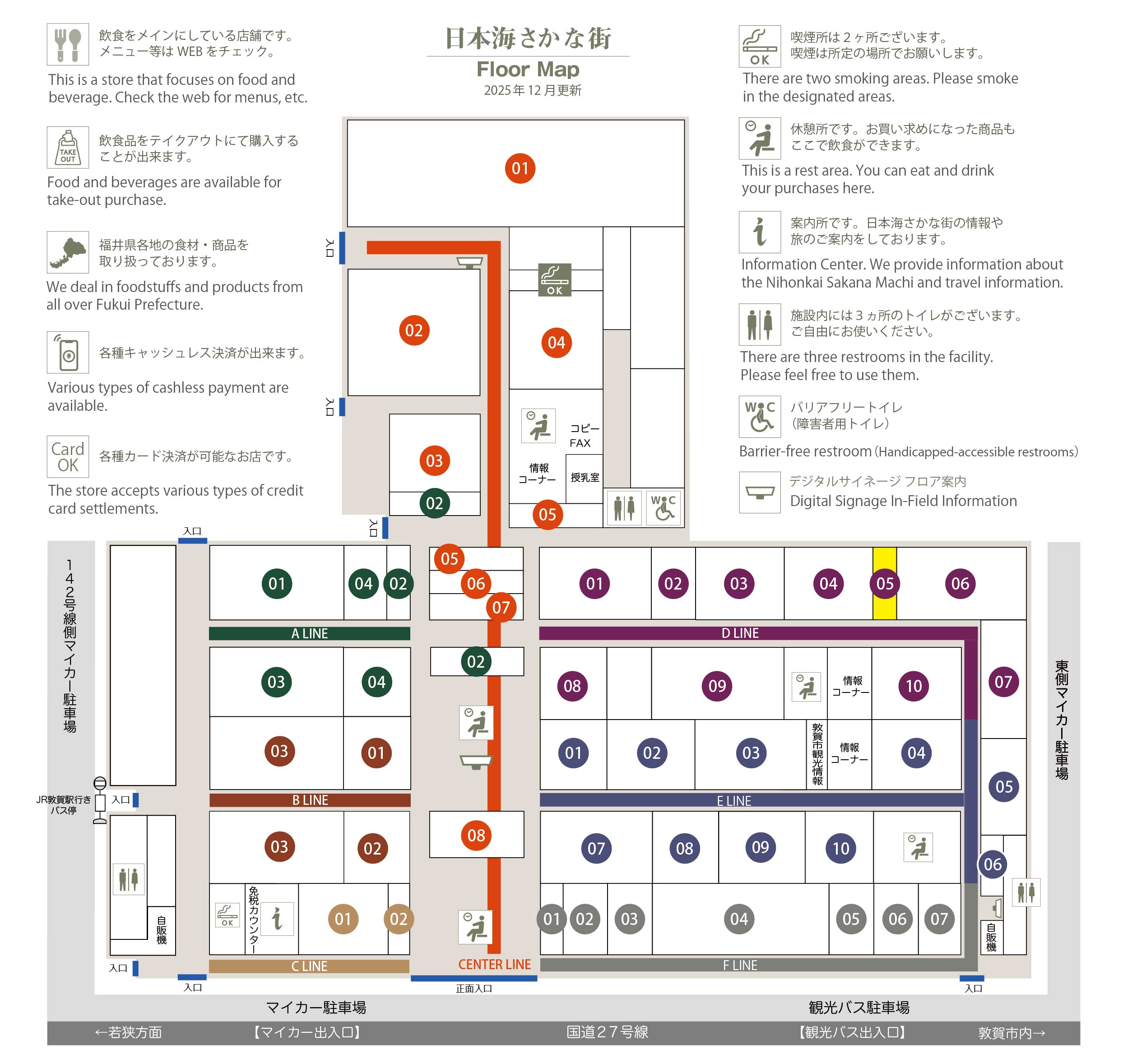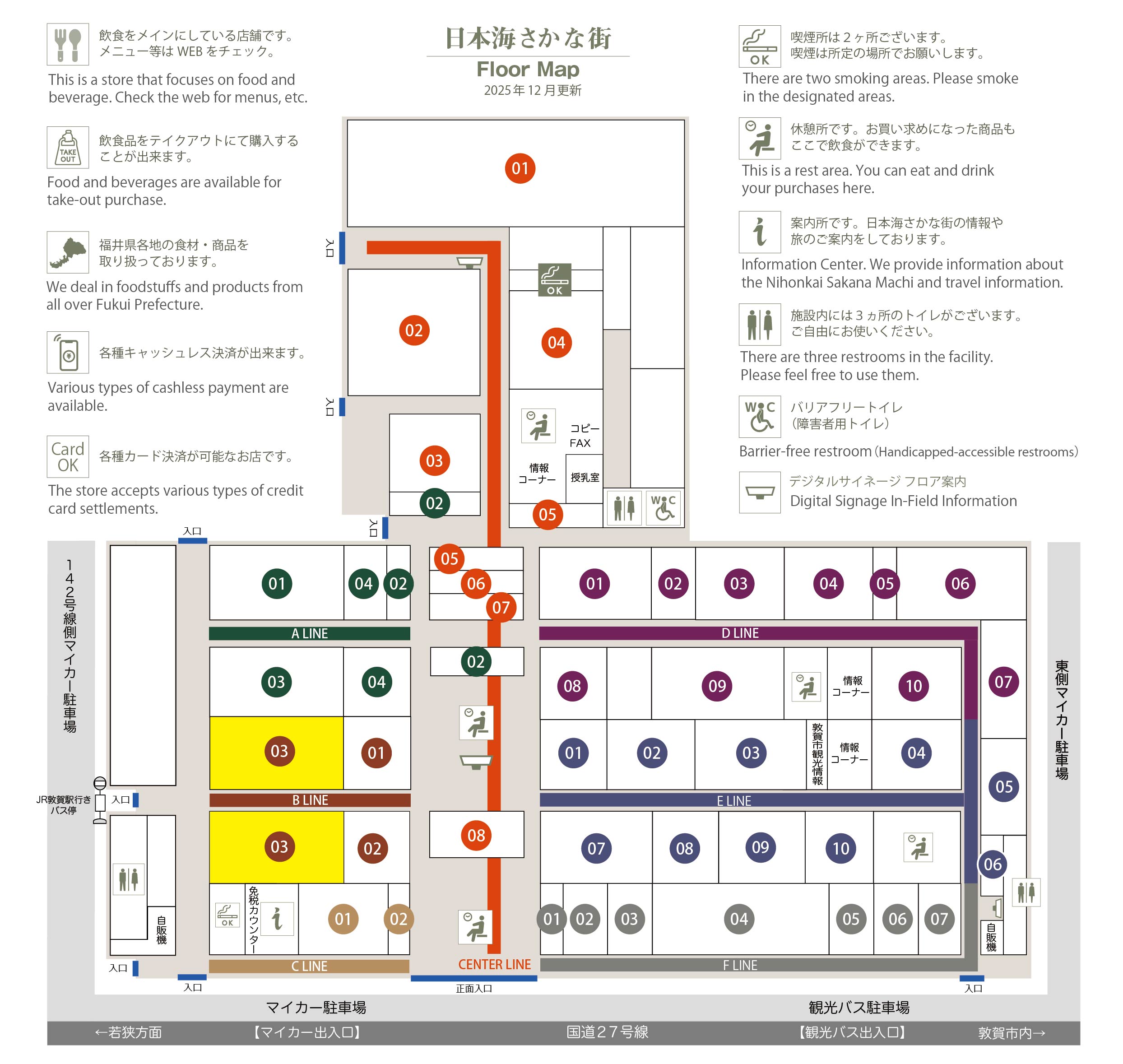 このマップでは、通路に面したお店をラインカラーと番号でご案内しております。