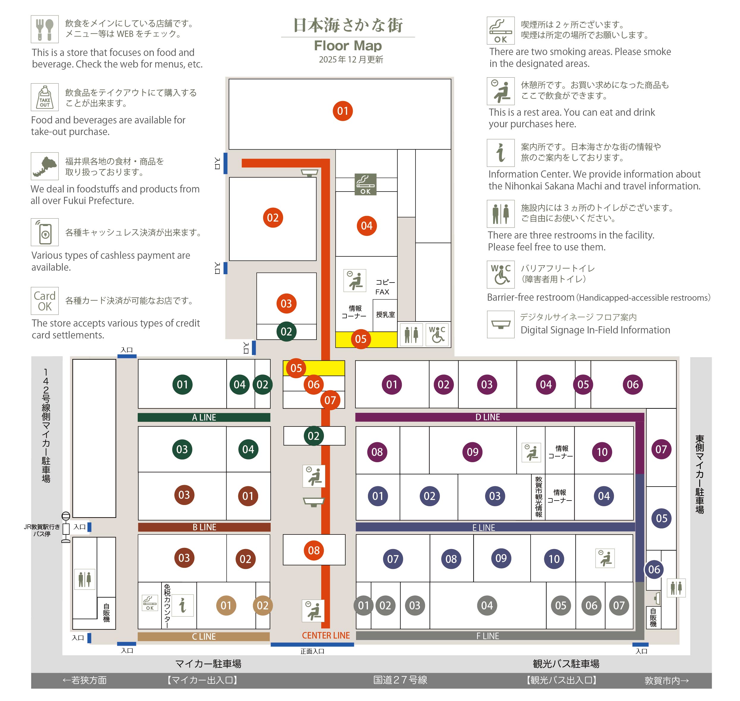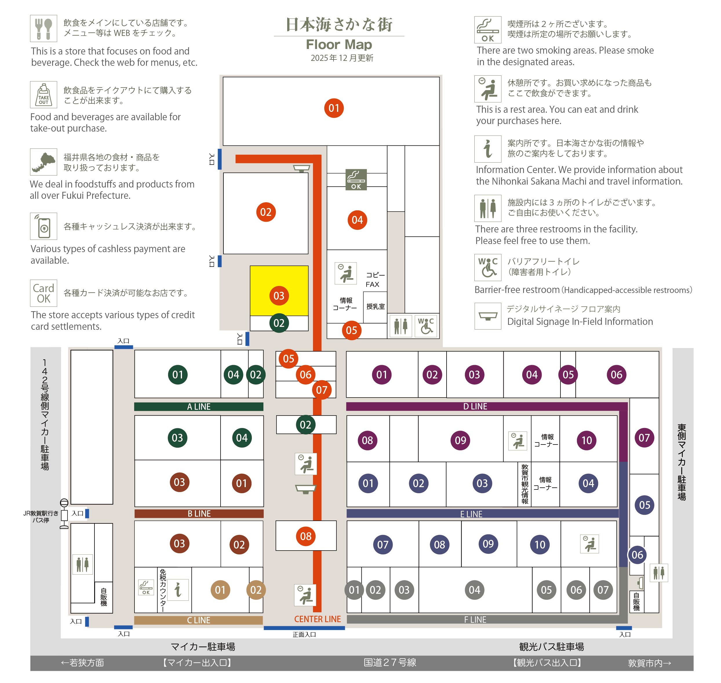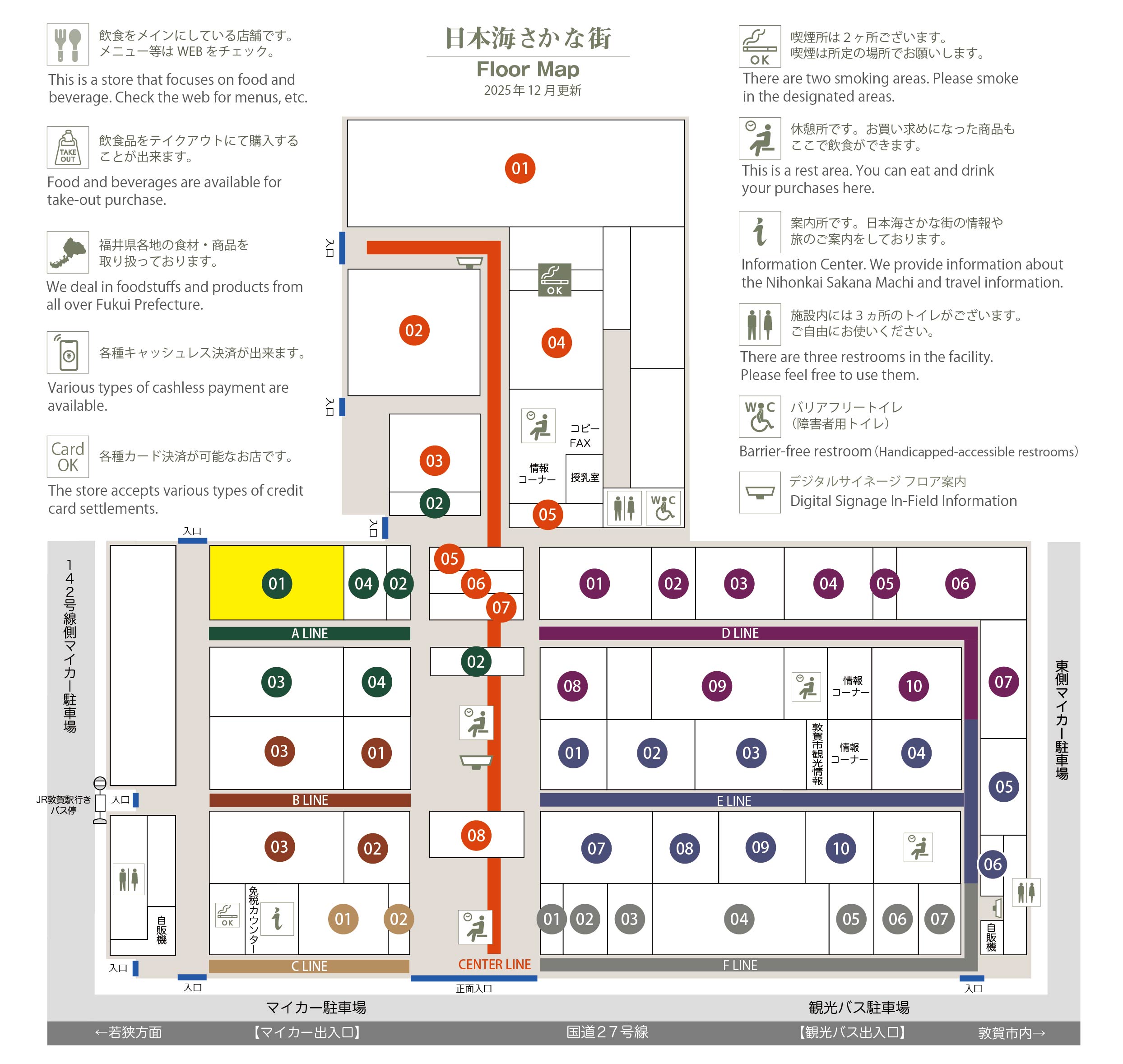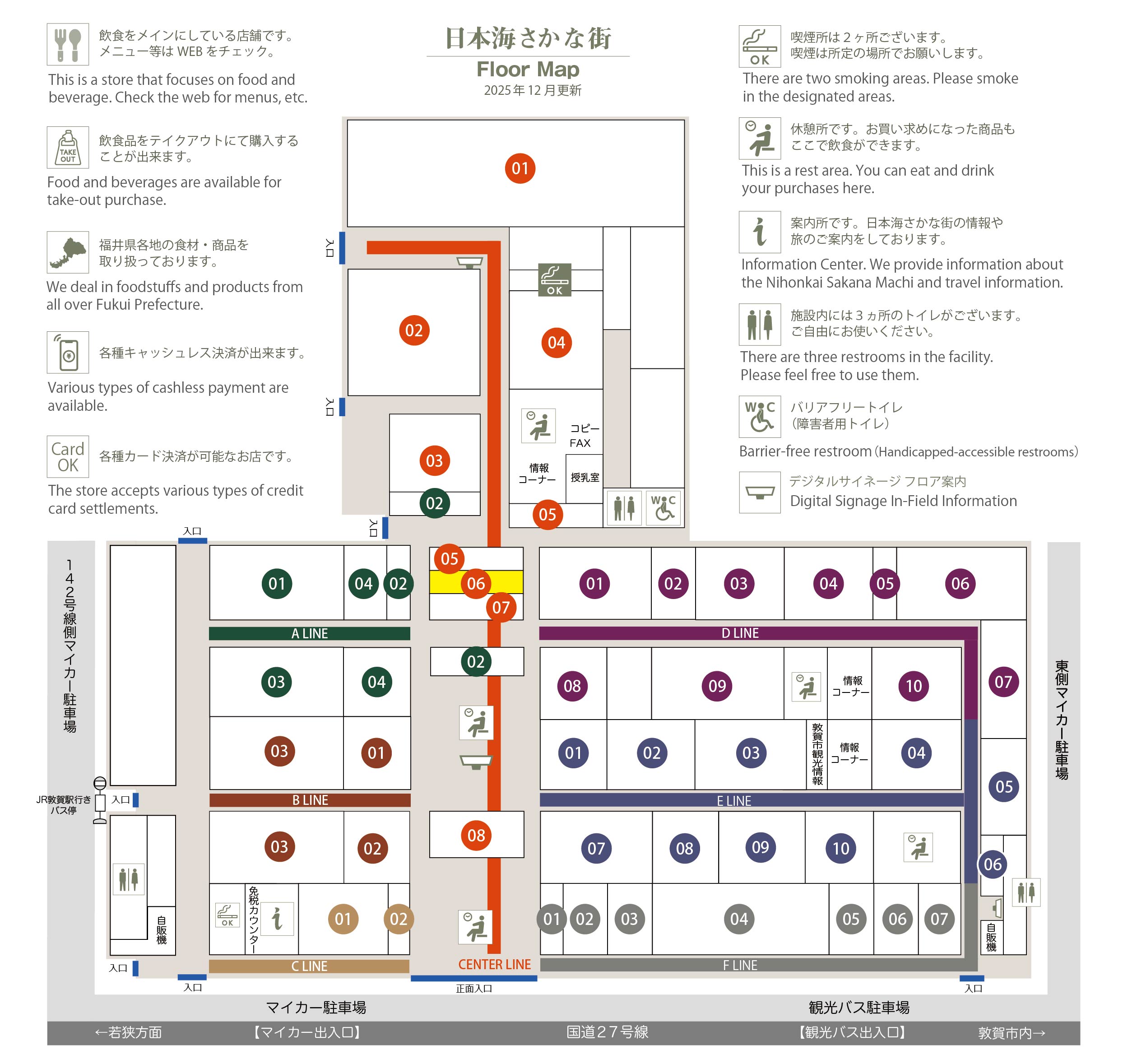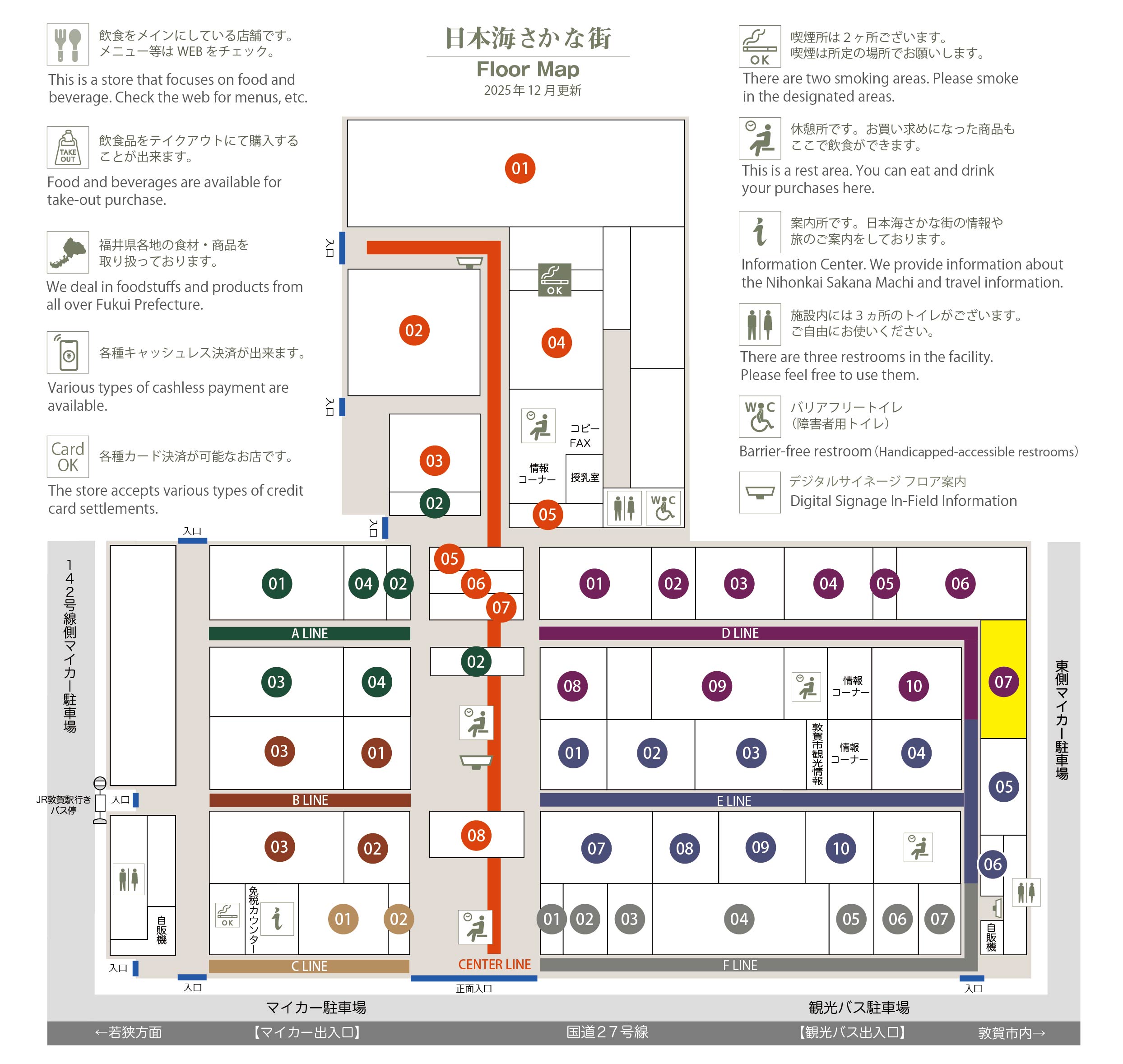 このマップでは、通路に面したお店をラインカラーと番号でご案内しております。