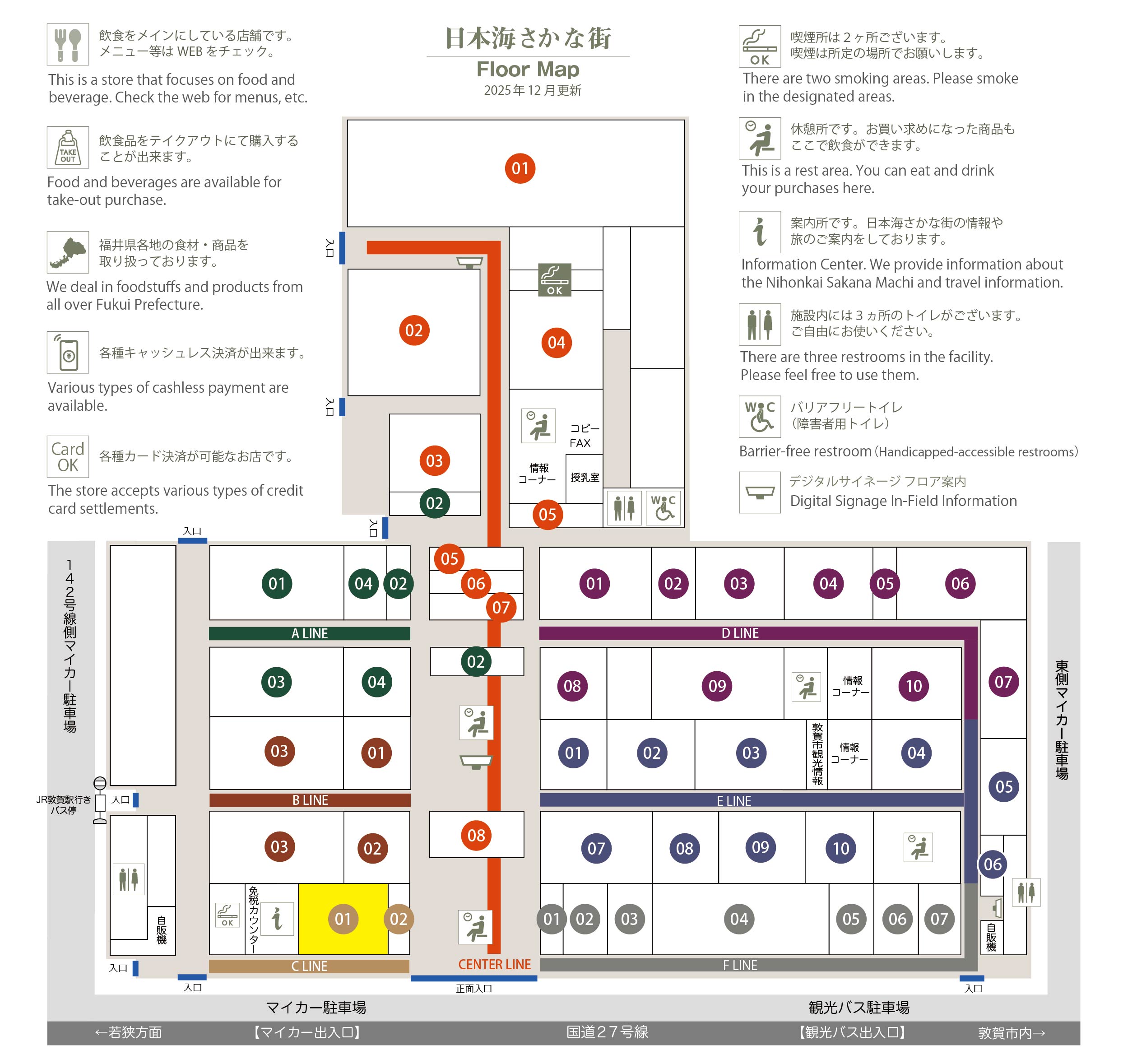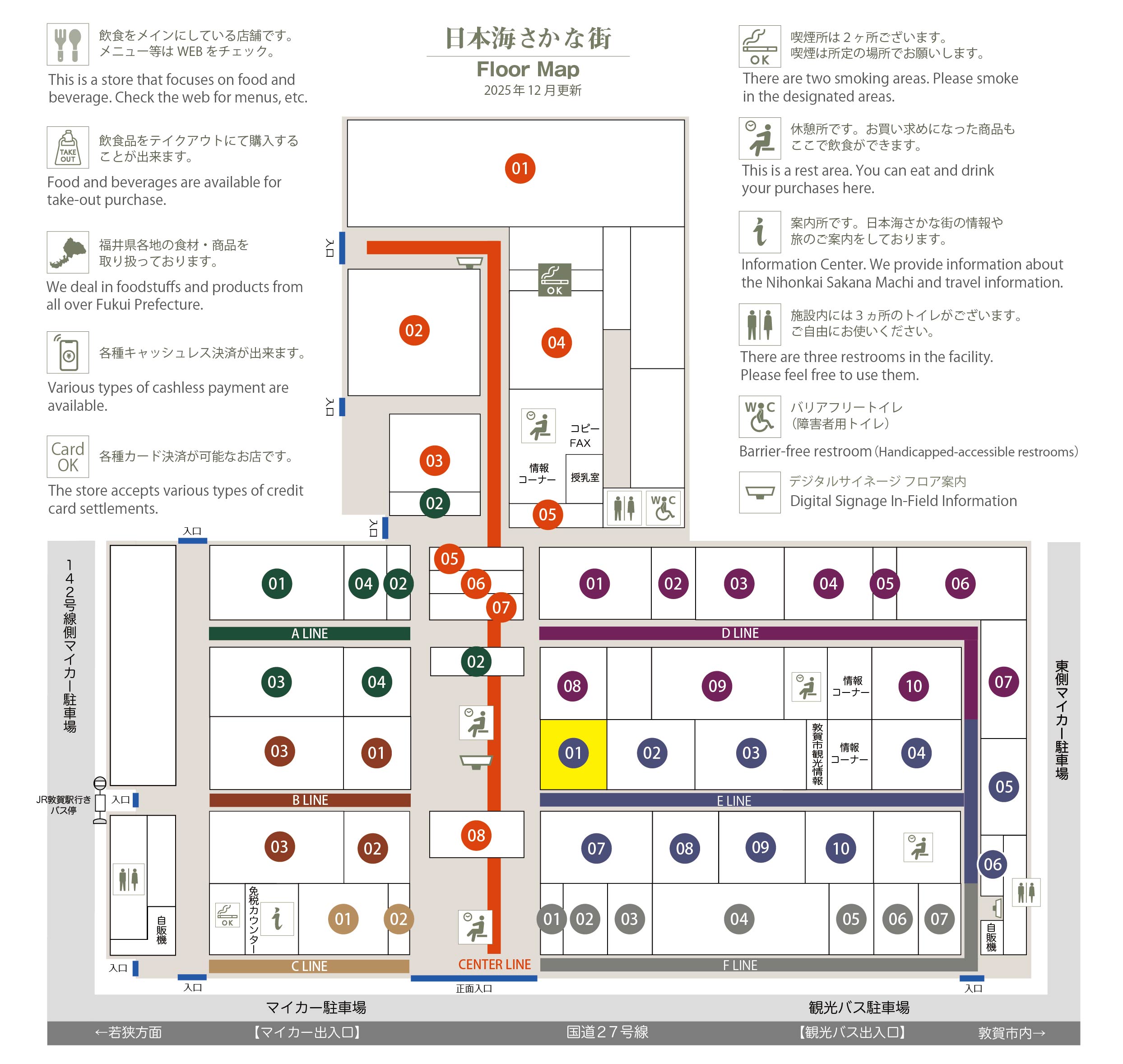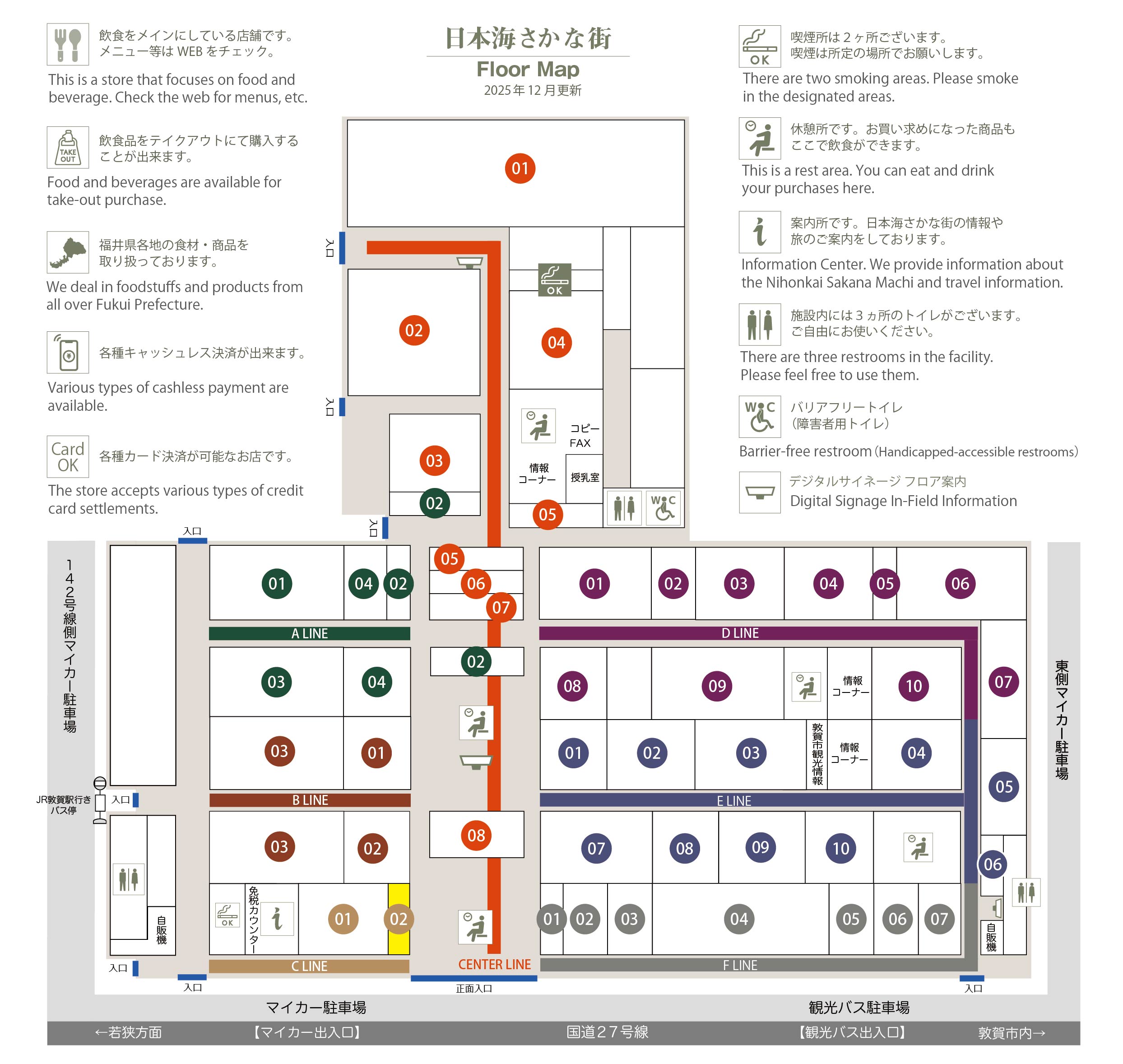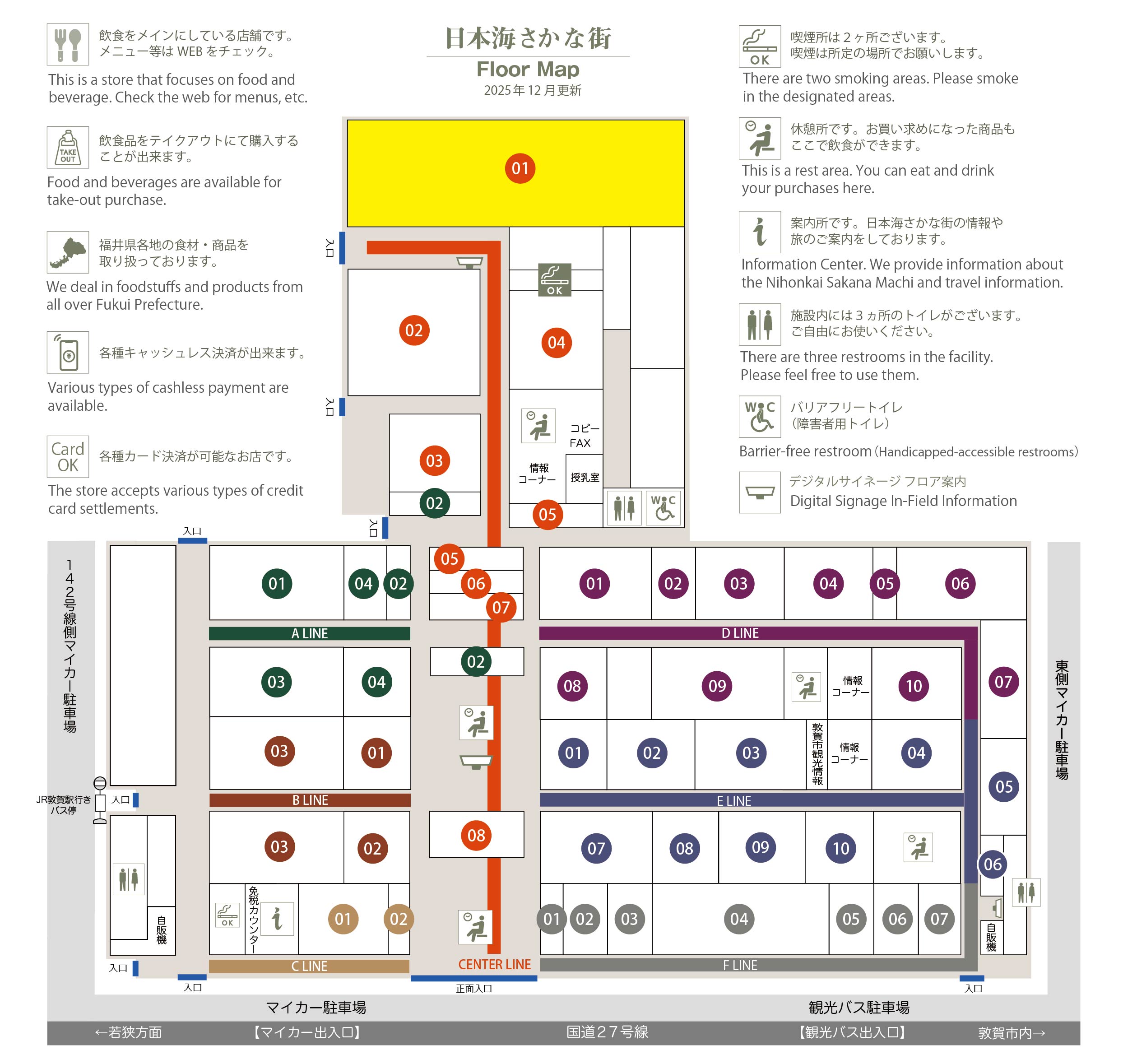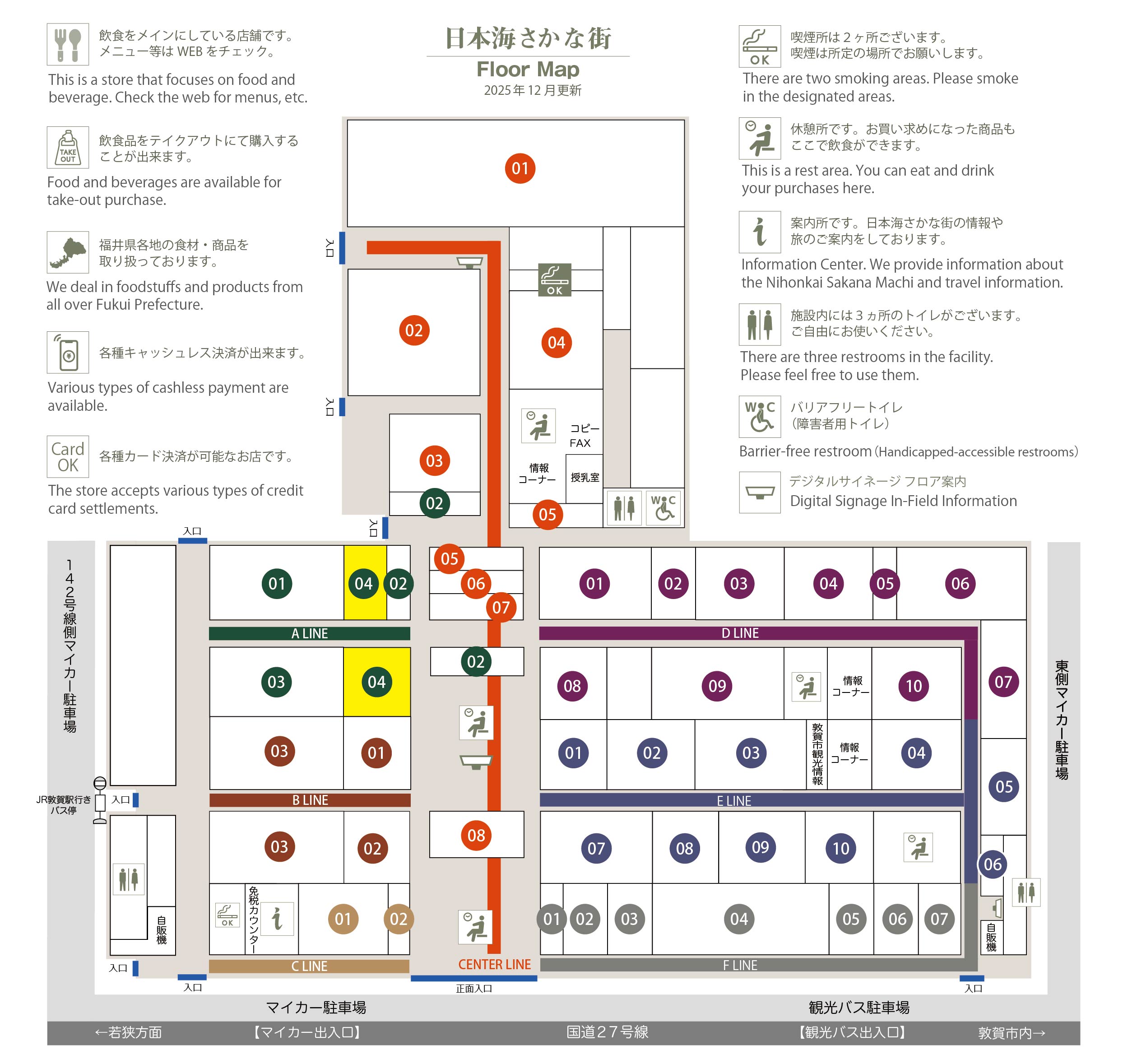 このマップでは、通路に面したお店をラインカラーと番号でご案内しております。