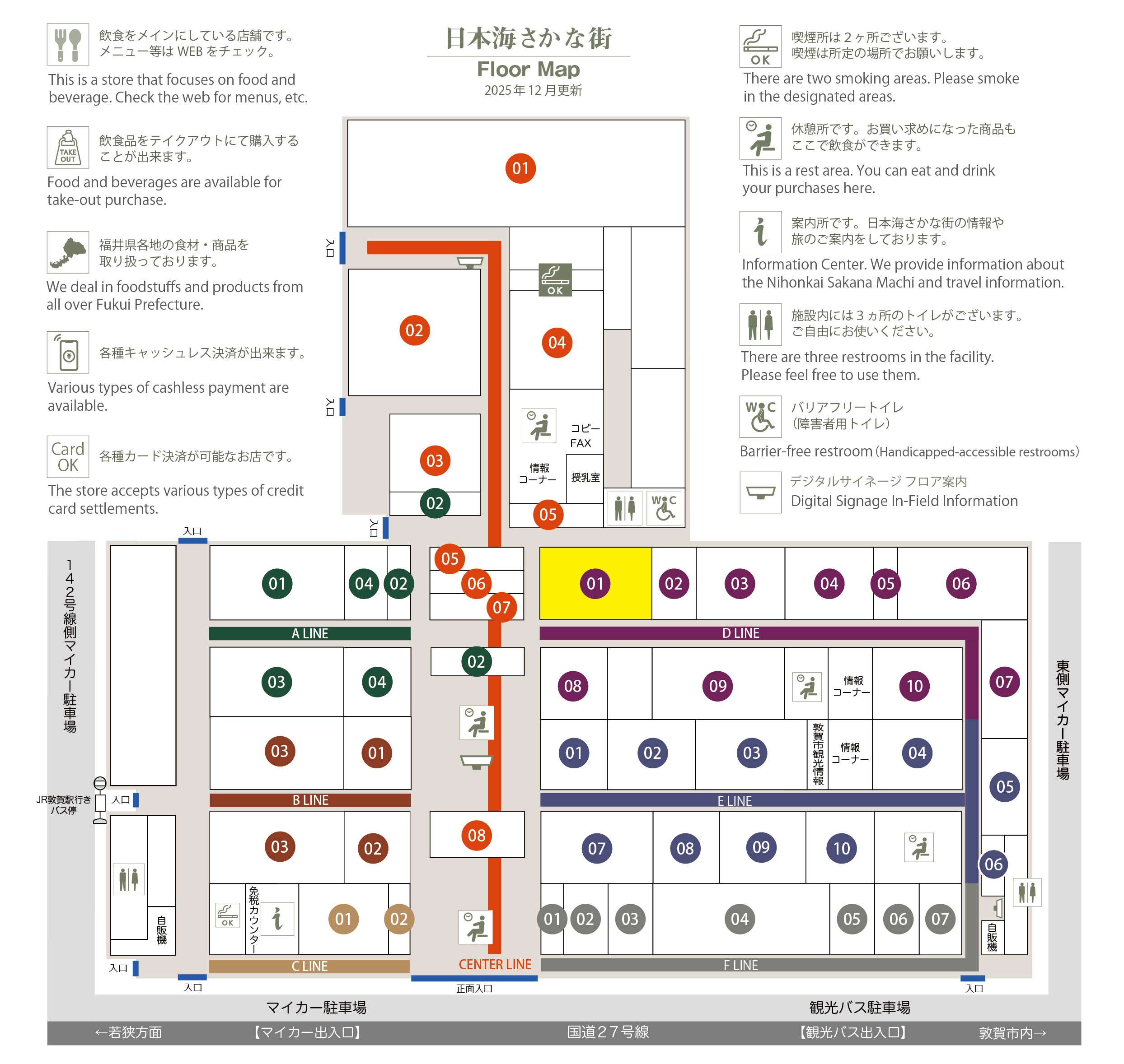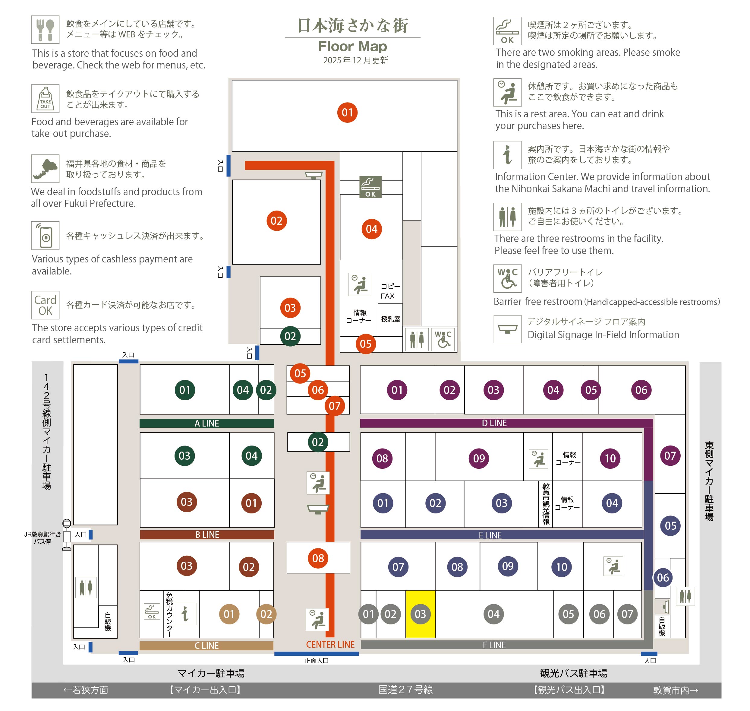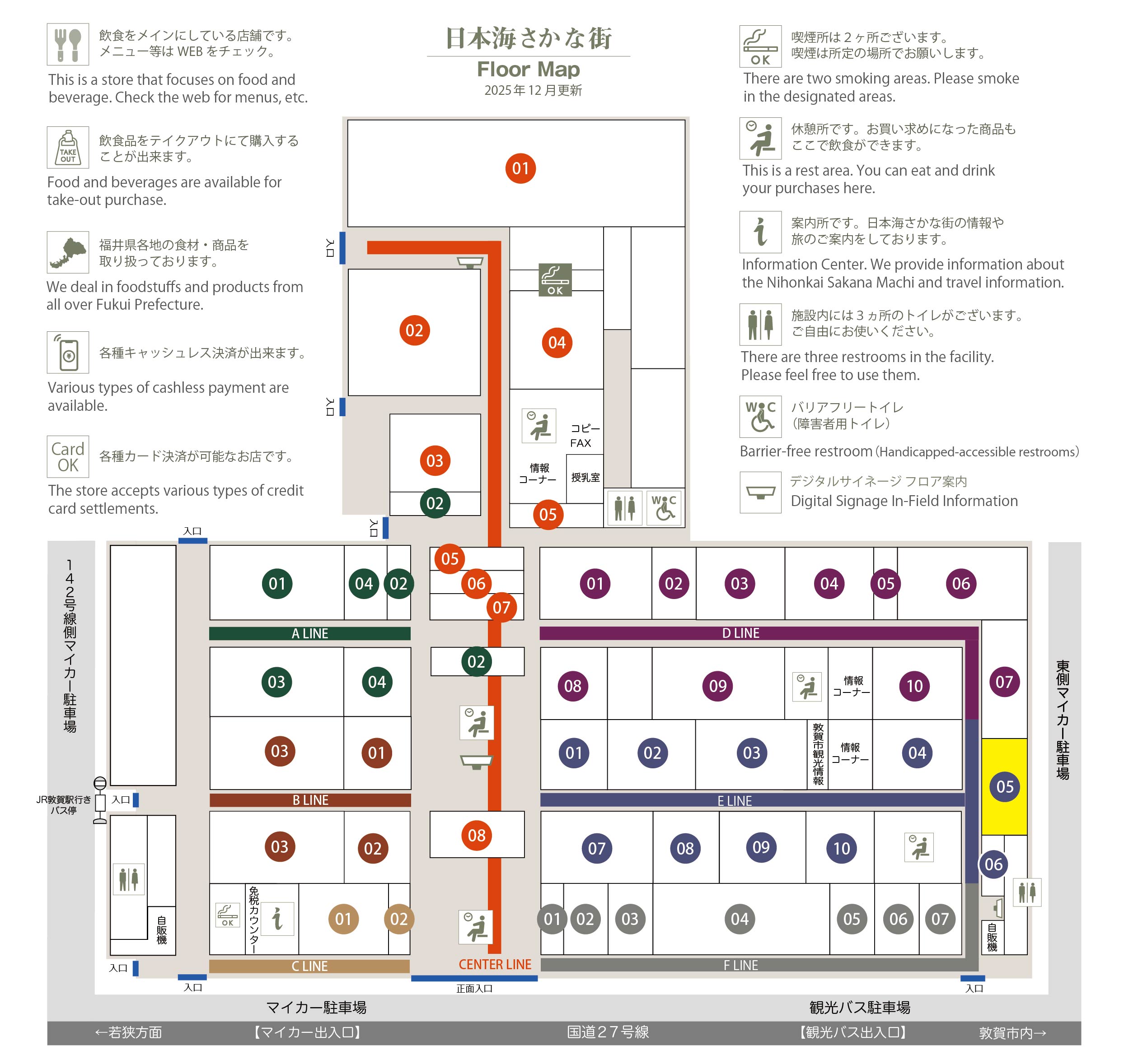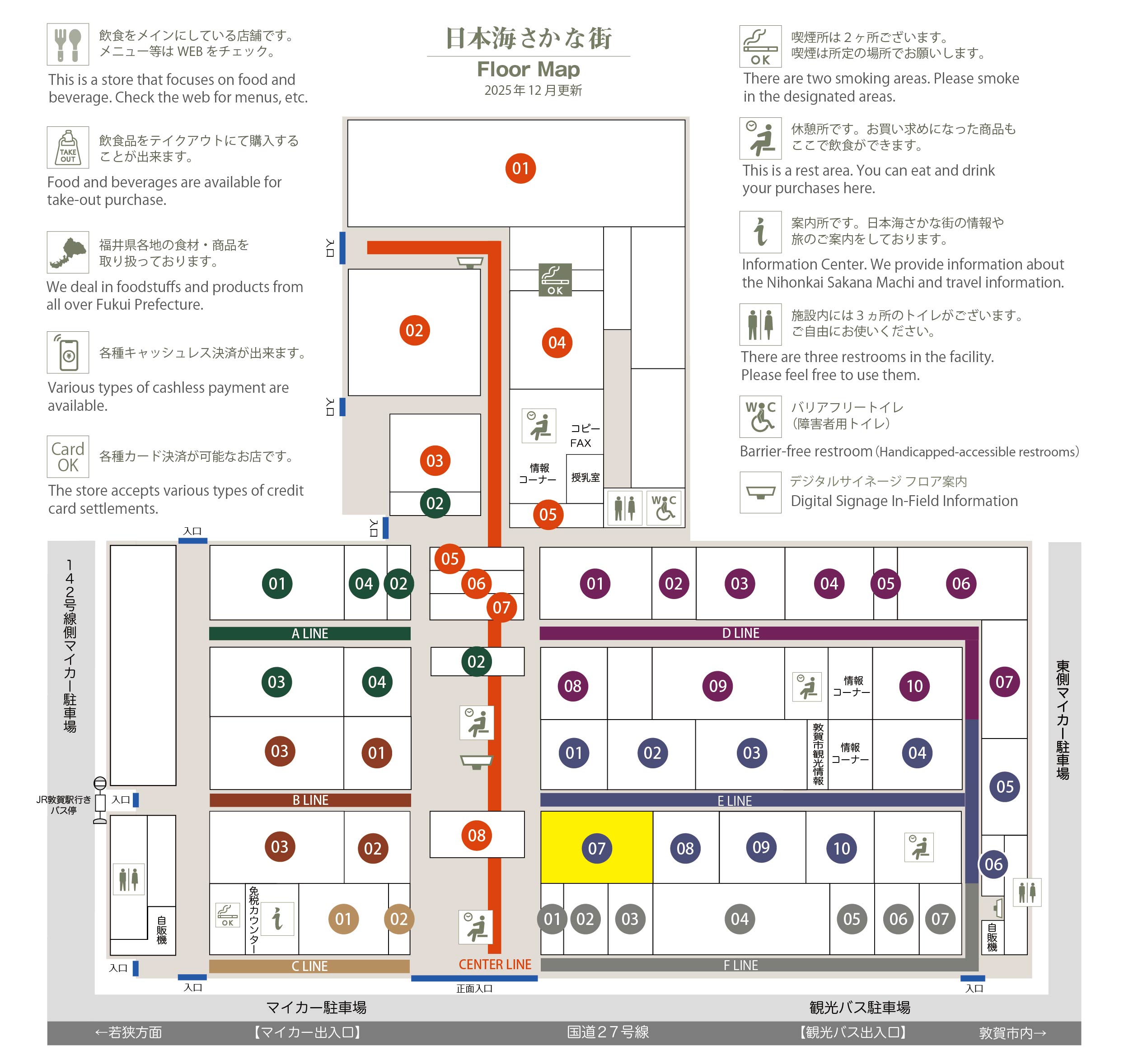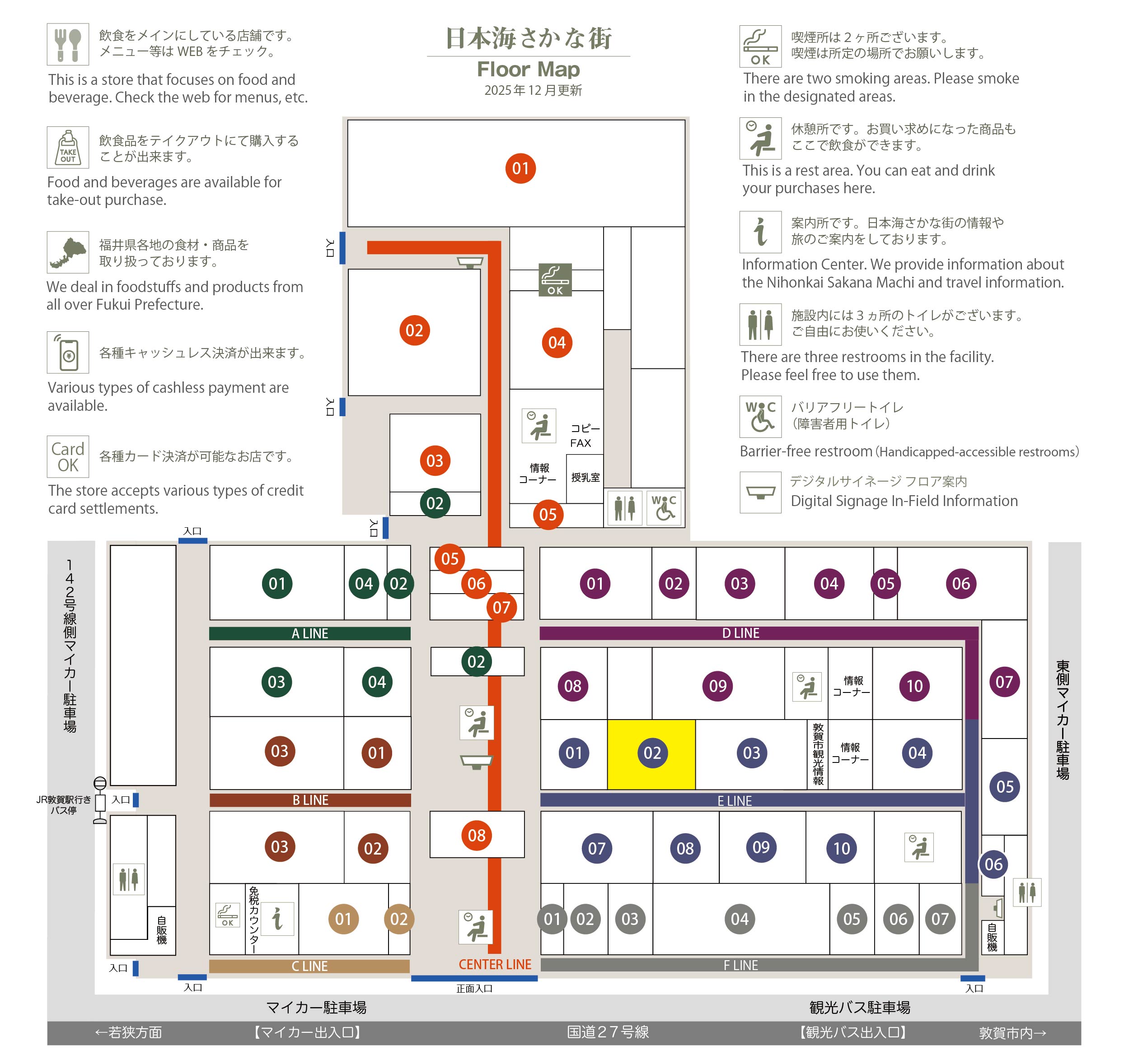 このマップでは、通路に面したお店をラインカラーと番号でご案内しております。