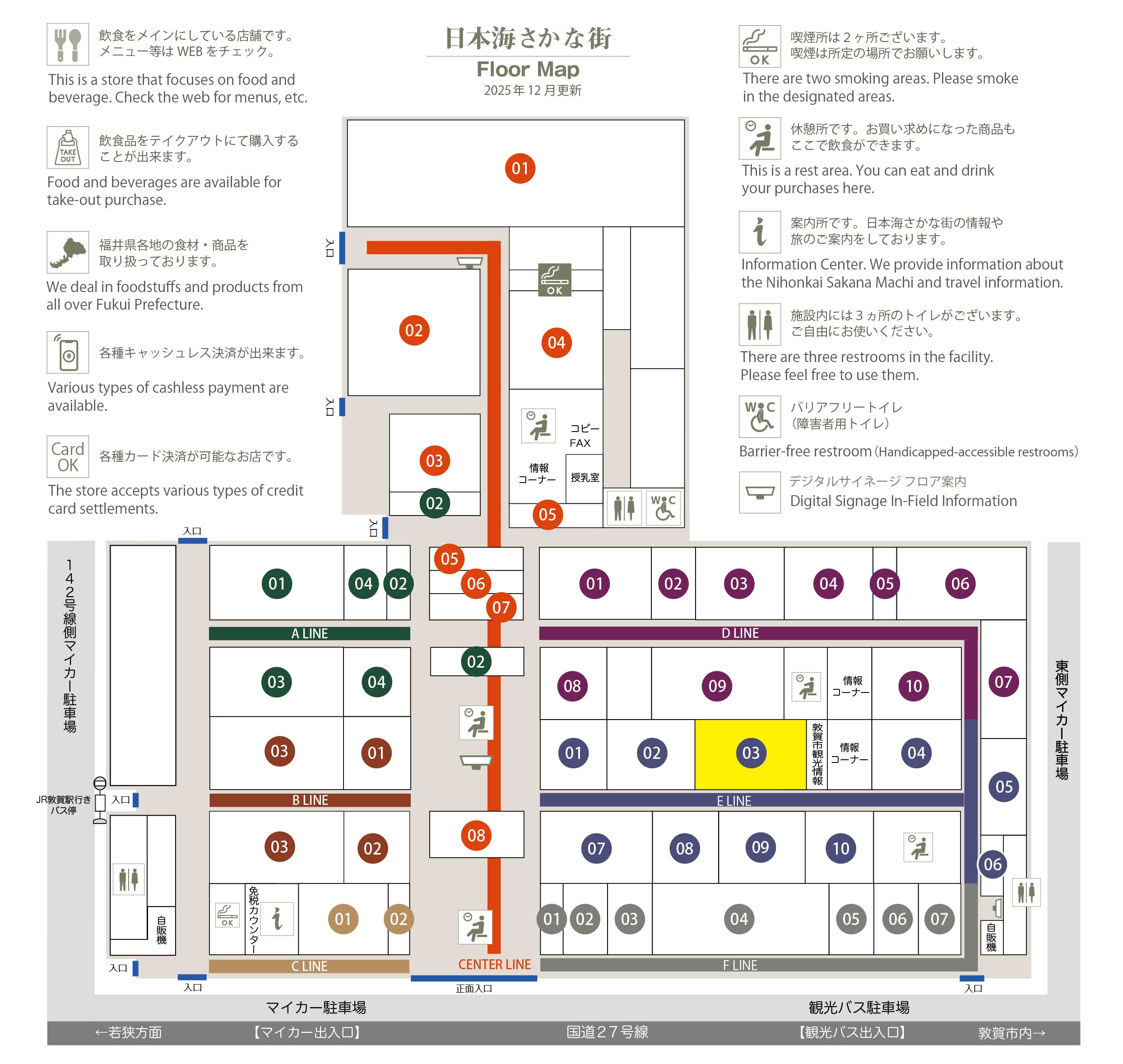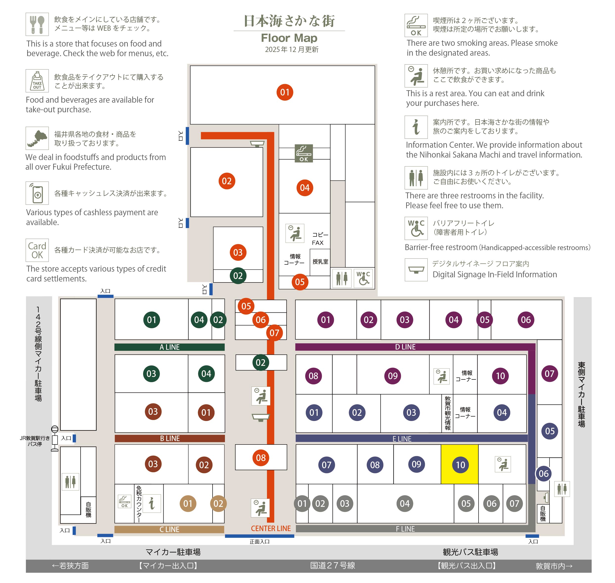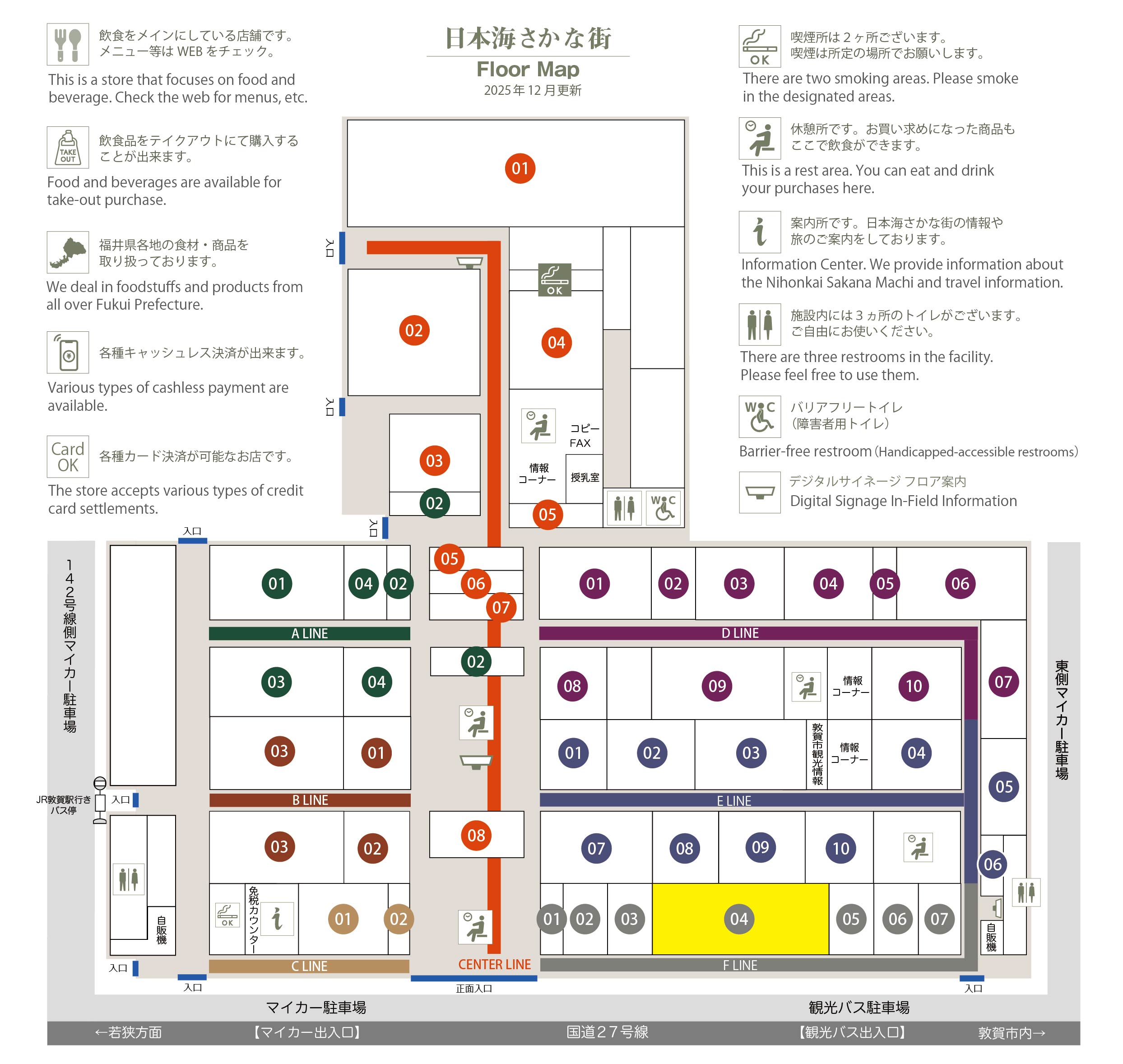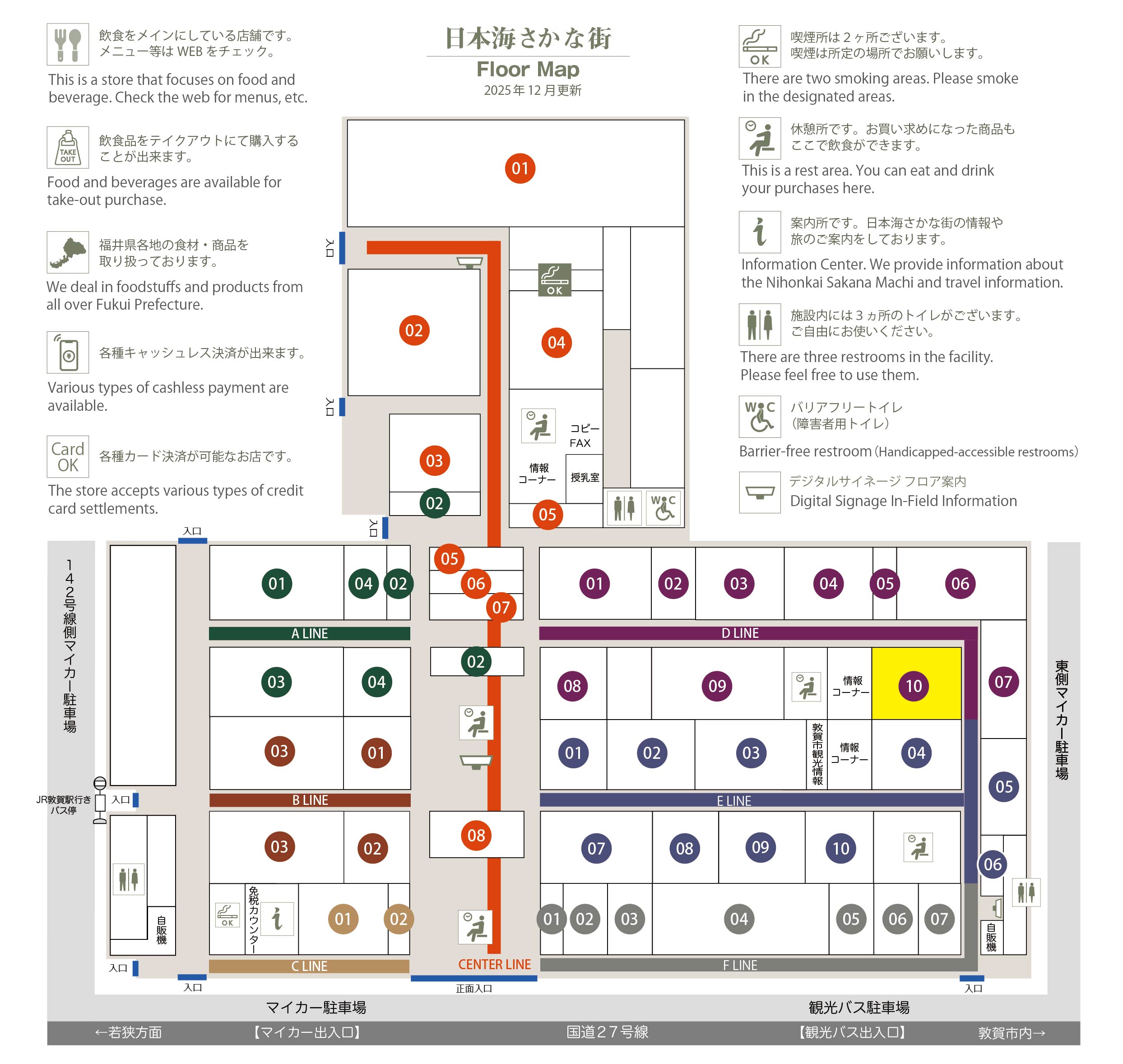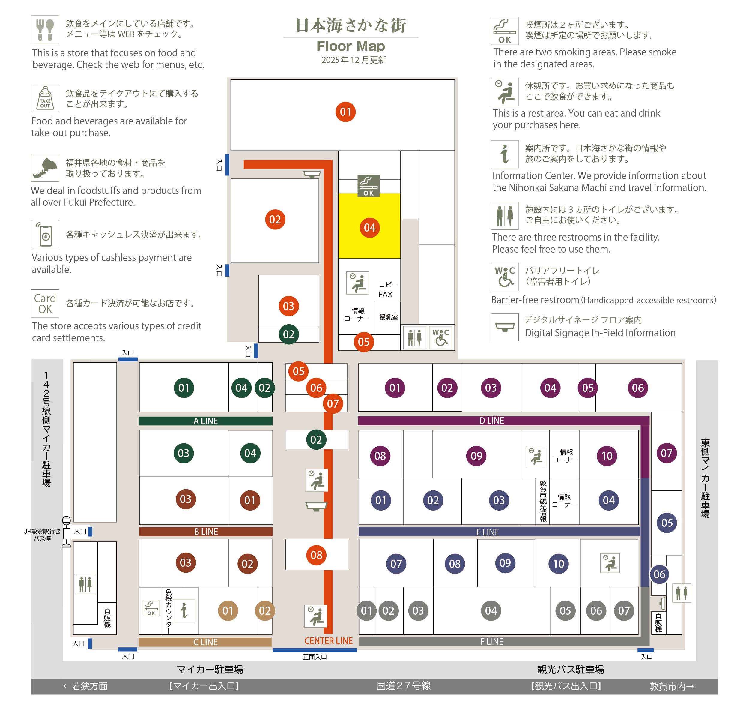 このマップでは、通路に面したお店をラインカラーと番号でご案内しております。