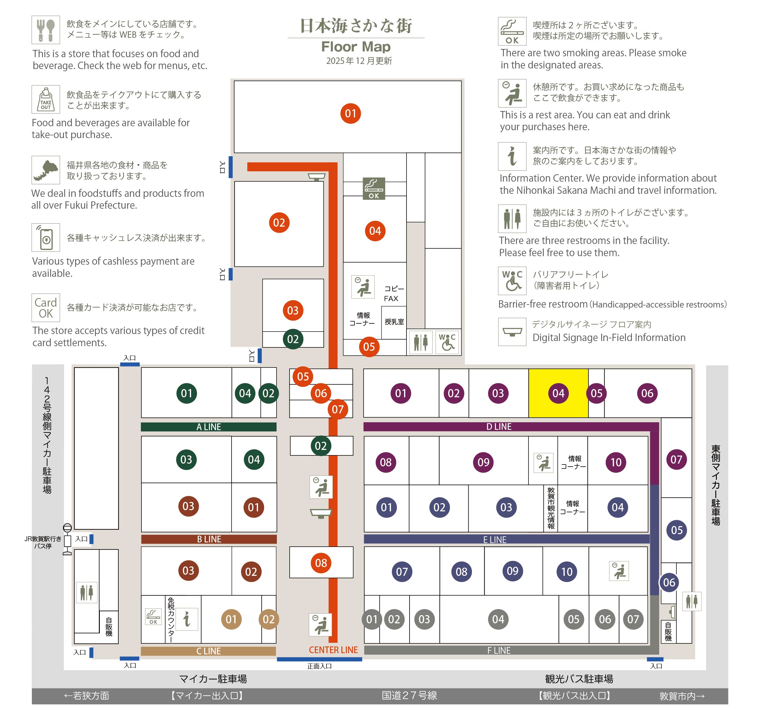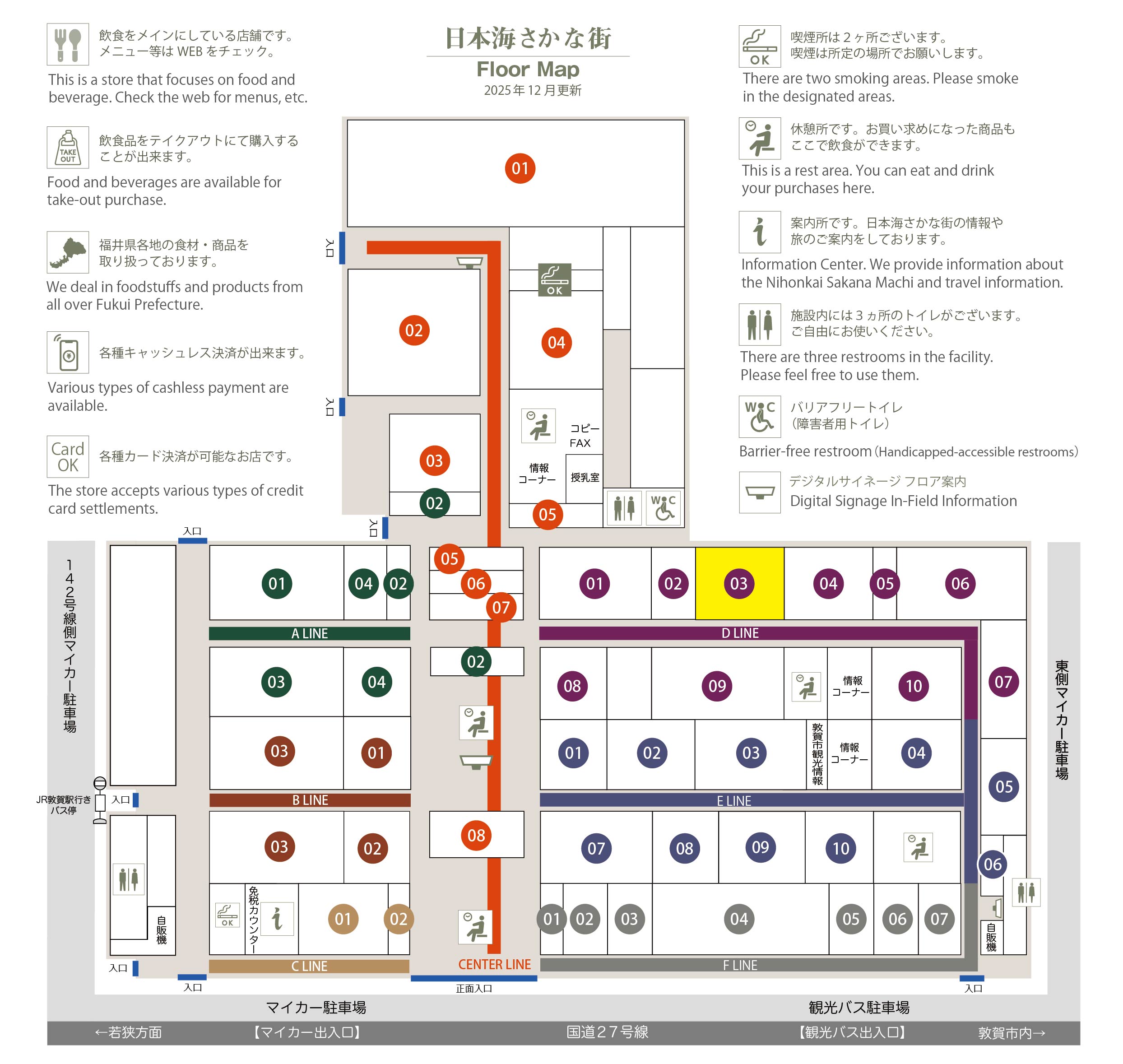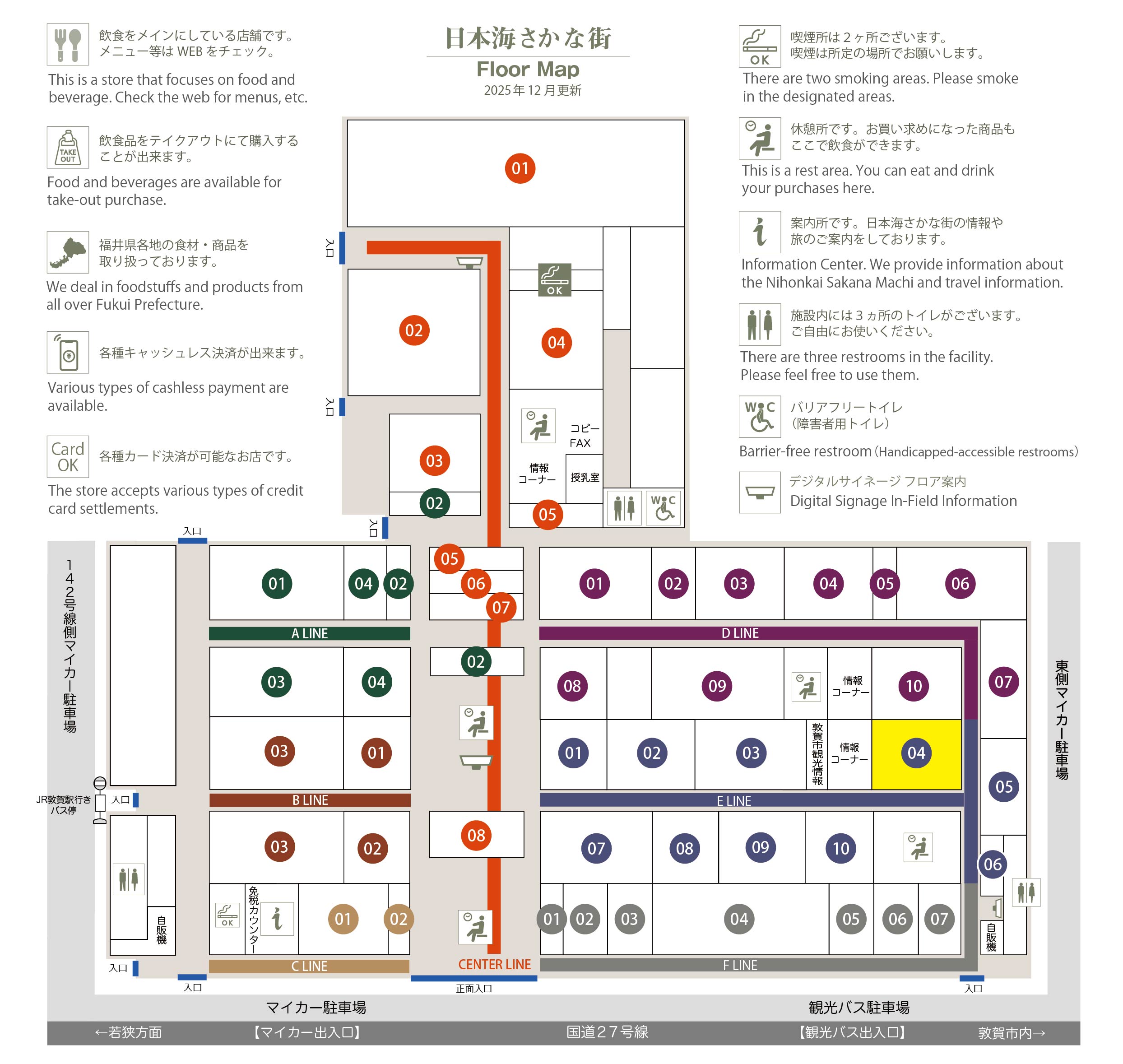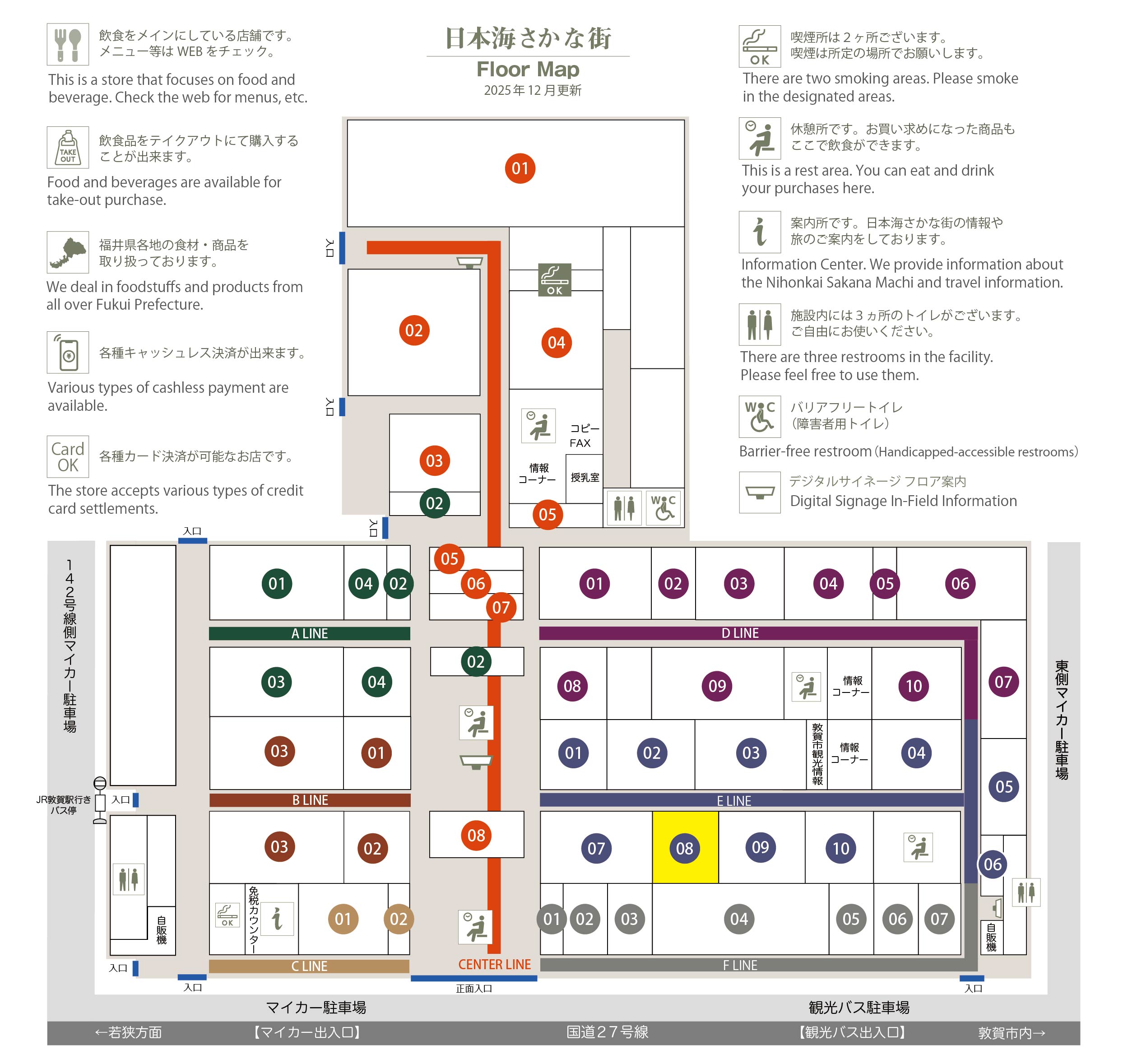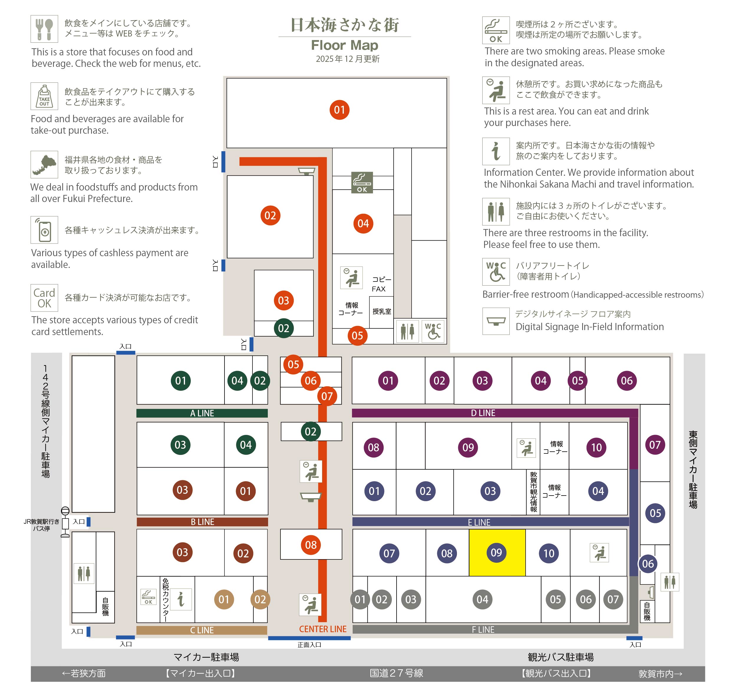 このマップでは、通路に面したお店をラインカラーと番号でご案内しております。